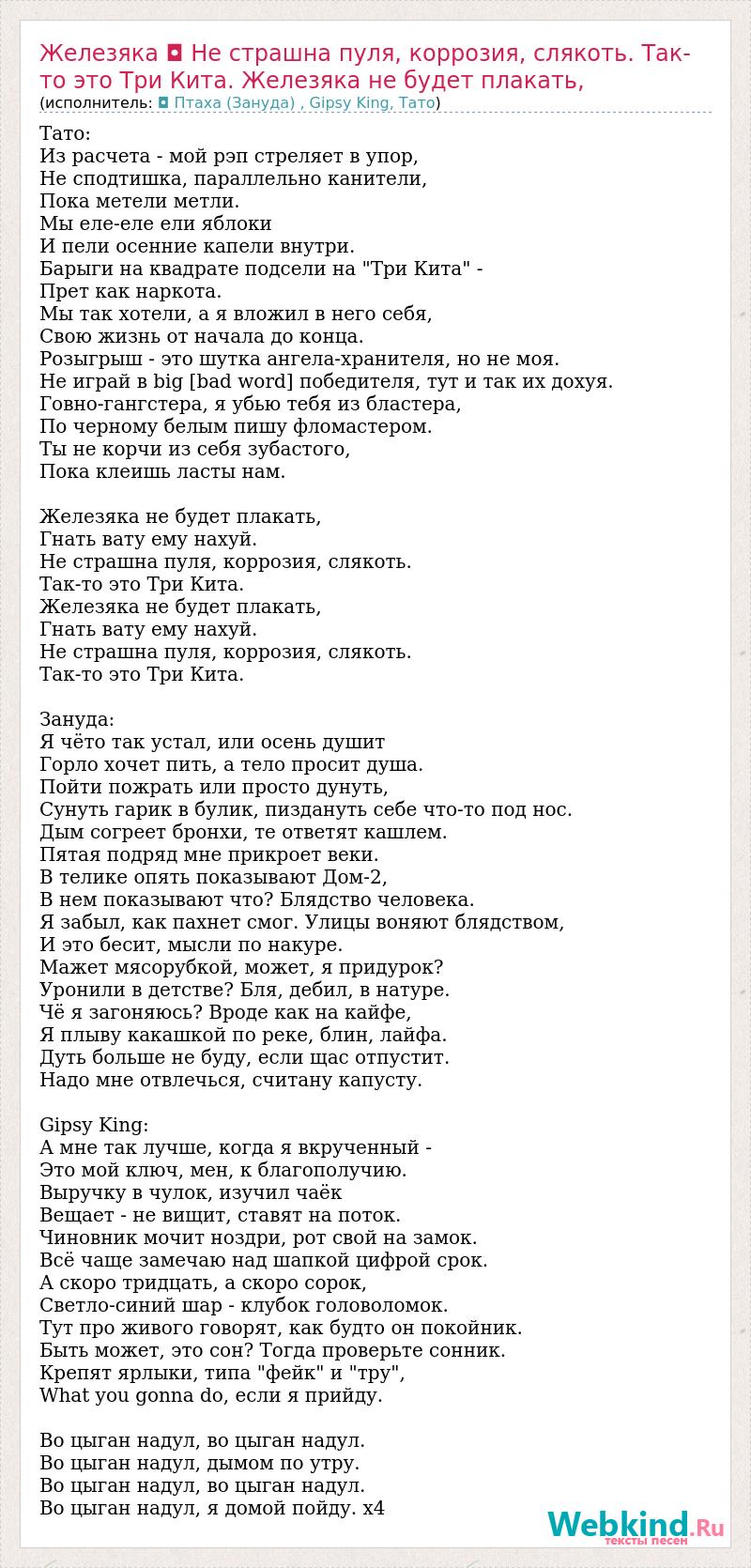 Тато: Из расчета - мой рэп стреляет в упор, Не сподтишка, параллельно канители, Пока метели метли. Мы еле-еле ели яблоки И пели осенние капели внутри. Барыги на квадрате подсели на "Три Кита" - Прет как наркота. Мы так хотели, а я вложил в него себя, Свою жизнь от начала до конца. Розыгрыш - это шутка ангела-хранителя, но не моя. Не играй в big [bad word] победителя, тут и так их дохуя. Говно-гангстера, я убью тебя из бластера, По черному белым пишу фломастером. Ты не корчи из себя зубастого, Пока клеишь ласты нам. Железяка не будет плакать, Гнать вату ему нахуй. Не страшна пуля, коррозия, слякоть. Так-то это Три Кита. Железяка не будет плакать, Гнать вату ему нахуй. Не страшна пуля, коррозия, слякоть. Так-то это Три Кита. Зануда: Я чёто так устал, или осень душит Горло хочет пить, а тело просит душа. Пойти пожрать или просто дунуть, Сунуть гарик в булик, пиздануть себе что-то под нос. Дым согреет бронхи, те ответят кашлем. Пятая подряд мне прикроет веки. В телике опять показывают Дом-2, В нем показывают что? Блядство человека. Я забыл, как пахнет смог. Улицы воняют блядством, И это бесит, мысли по накуре. Мажет мясорубкой, может, я придурок? Уронили в детстве? Бля, дебил, в натуре. Чё я загоняюсь? Вроде как на кайфе, Я плыву какашкой по реке, блин, лайфа. Дуть больше не буду, если щас отпустит. Надо мне отвлечься, считану капусту. Gipsy King: А мне так лучше, когда я вкрученный - Это мой ключ, мен, к благополучию. Выручку в чулок, изучил чаёк Вещает - не вищит, ставят на поток. Чиновник мочит ноздри, рот свой на замок. Всё чаще замечаю над шапкой цифрой срок. А скоро тридцать, а скоро сорок, Светло-синий шар - клубок головоломок. Тут про живого говорят, как будто он покойник. Быть может, это сон? Тогда проверьте сонник. Крепят ярлыки, типа "фейк" и "тру", What you gonna do, если я прийду. Во цыган надул, во цыган надул. Во цыган надул, дымом по утру. Во цыган надул, во цыган надул. Во цыган надул, я домой пойду. x4