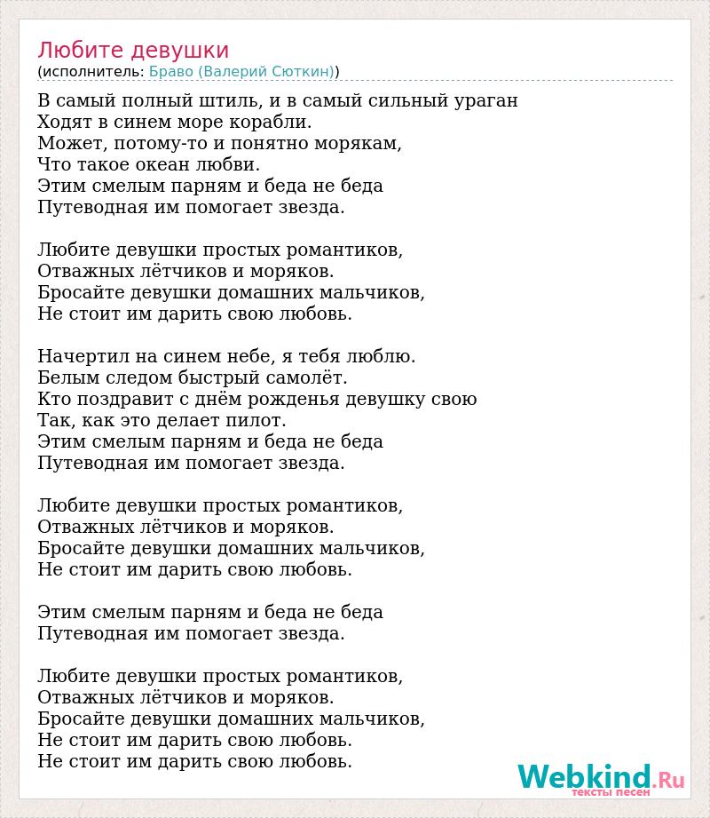 В самый полный штиль, и в самый сильный ураган Ходят в синем море корабли. Может, потому-то и понятно морякам, Что такое океан любви. Этим смелым парням и беда не беда Путеводная им помогает звезда. Любите девушки простых романтиков, Отважных лётчиков и моряков. Бросайте девушки домашних мальчиков, Не стоит им дарить свою любовь. Начертил на синем небе, я тебя люблю. Белым следом быстрый самолёт. Кто поздравит с днём рожденья девушку свою Так, как это делает пилот. Этим смелым парням и беда не беда Путеводная им помогает звезда. Любите девушки простых романтиков, Отважных лётчиков и моряков. Бросайте девушки домашних мальчиков, Не стоит им дарить свою любовь. Этим смелым парням и беда не беда Путеводная им помогает звезда. Любите девушки простых романтиков, Отважных лётчиков и моряков. Бросайте девушки домашних мальчиков, Не стоит им дарить свою любовь. Не стоит им дарить свою любовь.