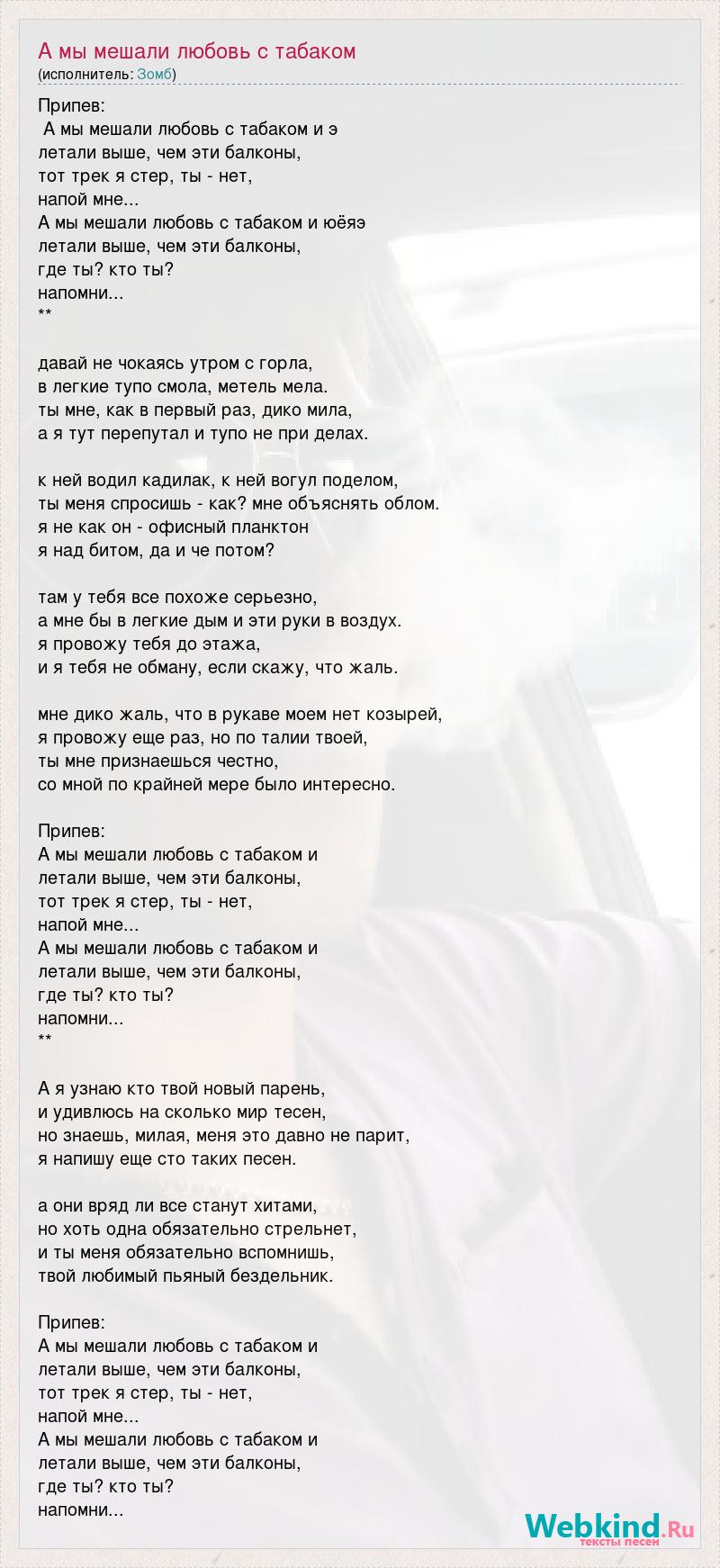 Припев: А мы мешали любовь с табаком и э летали выше, чем эти балконы, тот трек я стер, ты - нет, напой мне... А мы мешали любовь с табаком и юёяэ летали выше, чем эти балконы, где ты? кто ты? напомни... ** давай не чокаясь утром с горла, в легкие тупо смола, метель мела. ты мне, как в первый раз, дико мила, а я тут перепутал и тупо не при делах. к ней водил кадилак, к ней вогул поделом, ты меня спросишь - как? мне объяснять облом. я не как он - офисный планктон я над битом, да и че потом? там у тебя все похоже серьезно, а мне бы в легкие дым и эти руки в воздух. я провожу тебя до этажа, и я тебя не обману, если скажу, что жаль. мне дико жаль, что в рукаве моем нет козырей, я провожу еще раз, но по талии твоей, ты мне признаешься честно, со мной по крайней мере было интересно. Припев: А мы мешали любовь с табаком и летали выше, чем эти балконы, тот трек я стер, ты - нет, напой мне... А мы мешали любовь с табаком и летали выше, чем эти балконы, где ты? кто ты? напомни... ** А я узнаю кто твой новый парень, и удивлюсь на сколько мир тесен, но знаешь, милая, меня это давно не парит, я напишу еще сто таких песен. а они вряд ли все станут хитами, но хоть одна обязательно стрельнет, и ты меня обязательно вспомнишь, твой любимый пьяный бездельник. Припев: А мы мешали любовь с табаком и летали выше, чем эти балконы, тот трек я стер, ты - нет, напой мне... А мы мешали любовь с табаком и летали выше, чем эти балконы, где ты? кто ты? напомни...
