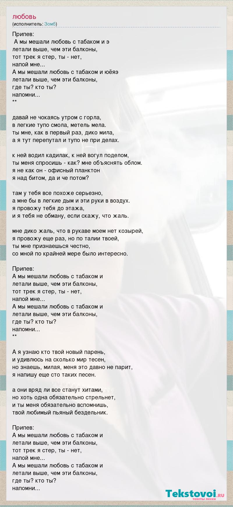 Припев: А мы мешали любовь с табаком и э летали выше, чем эти балконы, тот трек я стер, ты - нет, напой мне... А мы мешали любовь с табаком и юёяэ летали выше, чем эти балконы, где ты? кто ты? напомни... ** давай не чокаясь утром с горла, в легкие тупо смола, метель мела. ты мне, как в первый раз, дико мила, а я тут перепутал и тупо не при делах. к ней водил кадилак, к ней вогул поделом, ты меня спросишь - как? мне объяснять облом. я не как он - офисный планктон я над битом, да и че потом? там у тебя все похоже серьезно, а мне бы в легкие дым и эти руки в воздух. я провожу тебя до этажа, и я тебя не обману, если скажу, что жаль. мне дико жаль, что в рукаве моем нет козырей, я провожу еще раз, но по талии твоей, ты мне признаешься честно, со мной по крайней мере было интересно. Припев: А мы мешали любовь с табаком и летали выше, чем эти балконы, тот трек я стер, ты - нет, напой мне... А мы мешали любовь с табаком и летали выше, чем эти балконы, где ты? кто ты? напомни... ** А я узнаю кто твой новый парень, и удивлюсь на сколько мир тесен, но знаешь, милая, меня это давно не парит, я напишу еще сто таких песен. а они вряд ли все станут хитами, но хоть одна обязательно стрельнет, и ты меня обязательно вспомнишь, твой любимый пьяный бездельник. Припев: А мы мешали любовь с табаком и летали выше, чем эти балконы, тот трек я стер, ты - нет, напой мне... А мы мешали любовь с табаком и летали выше, чем эти балконы, где ты? кто ты? напомни...