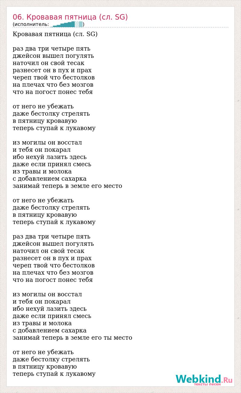 Кровавая пятница (сл. SG) раз два три четыре пять джейсон вышел погулять наточил он свой тесак разнесет он в пух и прах череп твой что бестолков на плечах что без мозгов что на погост понес тебя от него не убежать даже бестолку стрелять в пятницу кровавую теперь ступай к лукавому из могилы он восстал и тебя он покарал ибо нехуй лазить здесь даже если принял смесь из травы и молока с добавлением сахарка занимай теперь в земле его место от него не убежать даже бестолку стрелять в пятницу кровавую теперь ступай к лукавому раз два три четыре пять джейсон вышел погулять наточил он свой тесак разнесет он в пух и прах череп твой что бестолков на плечах что без мозгов что на погост понес тебя из могилы он восстал и тебя он покарал ибо нехуй лазить здесь даже если принял смесь из травы и молока с добавлением сахарка занимай теперь в земле его ты место от него не убежать даже бестолку стрелять в пятницу кровавую теперь ступай к лукавому
