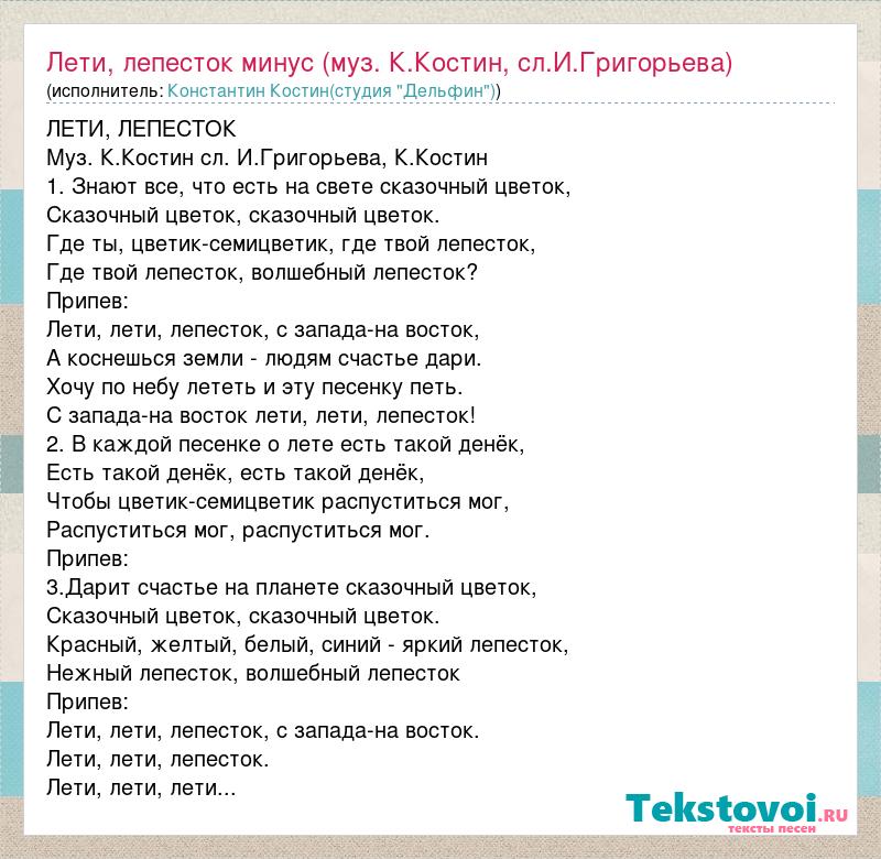 ЛЕТИ, ЛЕПЕСТОК Муз. К.Костин сл. И.Григорьева, К.Костин 1. Знают все, что есть на свете сказочный цветок, Сказочный цветок, сказочный цветок. Где ты, цветик-семицветик, где твой лепесток, Где твой лепесток, волшебный лепесток? Припев: Лети, лети, лепесток, с запада-на восток, А коснешься земли - людям счастье дари. Хочу по небу лететь и эту песенку петь. С запада-на восток лети, лети, лепесток! 2. В каждой песенке о лете есть такой денёк, Есть такой денёк, есть такой денёк, Чтобы цветик-семицветик распуститься мог, Распуститься мог, распуститься мог. Припев: 3.Дарит счастье на планете сказочный цветок, Сказочный цветок, сказочный цветок. Красный, желтый, белый, синий - яркий лепесток, Нежный лепесток, волшебный лепесток Припев: Лети, лети, лепесток, с запада-на восток. Лети, лети, лепесток. Лети, лети, лети...