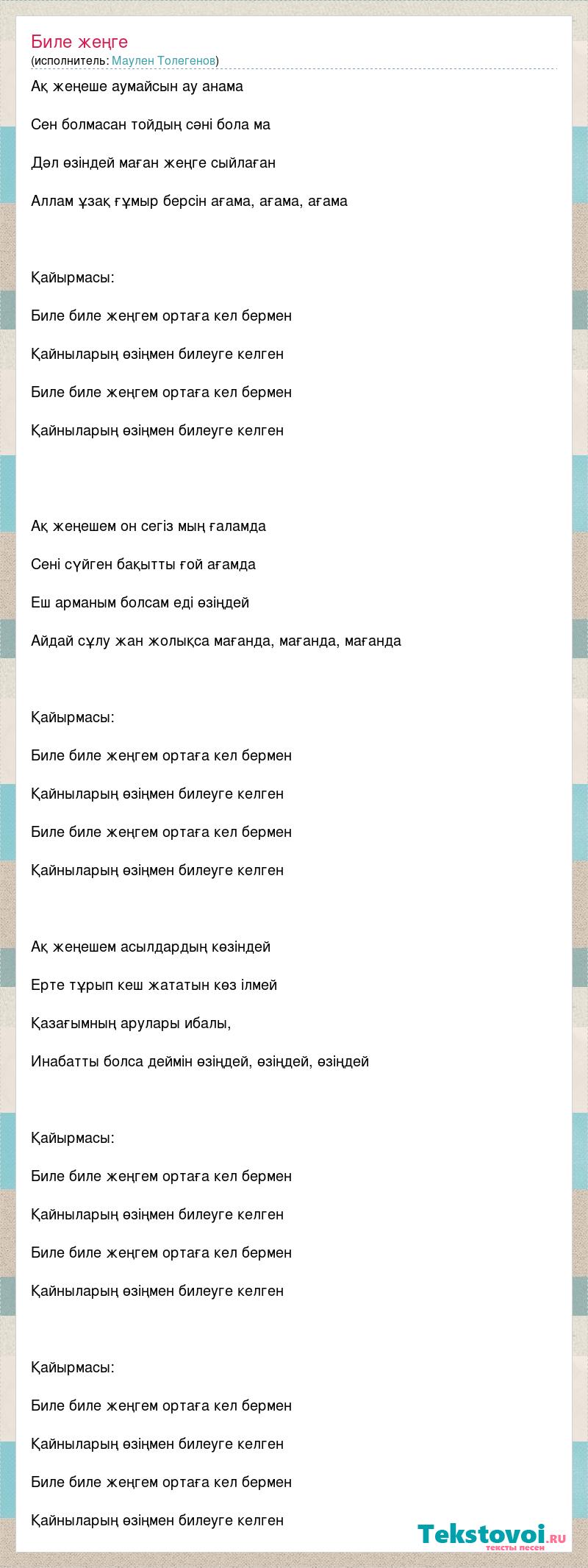 Ақ жеңеше аумайсын ау анама Сен болмасан тойдың сәні бола ма Дәл өзіндей маған жеңге сыйлаған Аллам ұзақ ғұмыр берсін ағама, ағама, ағама Қайырмасы: Биле биле жеңгем ортаға кел бермен Қайныларың өзіңмен билеуге келген Биле биле жеңгем ортаға кел бермен Қайныларың өзіңмен билеуге келген Ақ жеңешем он сегіз мың ғаламда Сені сүйген бақытты ғой ағамда Еш арманым болсам еді өзіңдей Айдай сұлу жан жолықса мағанда, мағанда, мағанда Қайырмасы: Биле биле жеңгем ортаға кел бермен Қайныларың өзіңмен билеуге келген Биле биле жеңгем ортаға кел бермен Қайныларың өзіңмен билеуге келген Ақ жеңешем асылдардың көзіндей Ерте тұрып кеш жататын көз ілмей Қазағымның арулары ибалы, Инабатты болса деймін өзіңдей, өзіңдей, өзіңдей Қайырмасы: Биле биле жеңгем ортаға кел бермен Қайныларың өзіңмен билеуге келген Биле биле жеңгем ортаға кел бермен Қайныларың өзіңмен билеуге келген Қайырмасы: Биле биле жеңгем ортаға кел бермен Қайныларың өзіңмен билеуге келген Биле биле жеңгем ортаға кел бермен Қайныларың өзіңмен билеуге келген