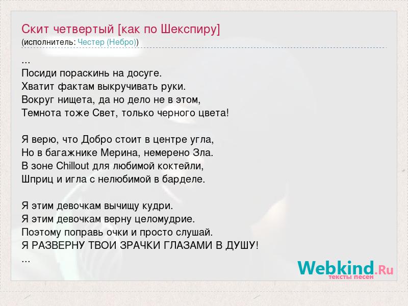 ... Посиди пораскинь на досуге. Хватит фактам выкручивать руки. Вокруг нищета, да но дело не в этом, Темнота тоже Свет, только черного цвета! Я верю, что Добро стоит в центре угла, Но в багажнике Мерина, немерено Зла. В зоне Chillout для любимой коктейли, Шприц и игла с нелюбимой в барделе. Я этим девочкам вычищу кудри. Я этим девочкам верну целомудрие. Поэтому поправь очки и просто слушай. Я РАЗВЕРНУ ТВОИ ЗРАЧКИ ГЛАЗАМИ В ДУШУ! ...