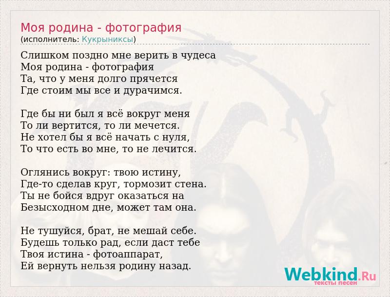 Слишком поздно мне верить в чудеса Моя родина - фотография Та, что у меня долго прячется Где стоим мы все и дурачимся. Где бы ни был я всё вокруг меня То ли вертится, то ли мечется. Не хотел бы я всё начать с нуля, То что есть во мне, то не лечится. Оглянись вокруг: твою истину, Где-то сделав круг, тормозит стена. Ты не бойся вдруг оказаться на Безысходном дне, может там она. Не тушуйся, брат, не мешай себе. Будешь только рад, если даст тебе Твоя истина - фотоаппарат, Ей вернуть нельзя родину назад.