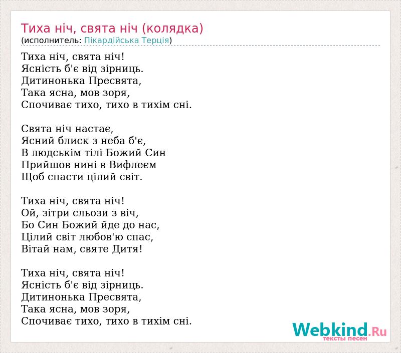 Тиха ніч, свята ніч! Ясність б'є від зірниць. Дитинонька Пресвята, Така ясна, мов зоря, Спочиває тихо, тихо в тихім сні. Свята ніч настає, Ясний блиск з неба б'є, В людськім тілі Божий Син Прийшов нині в Вифлеєм Щоб спасти цілий світ. Тиха ніч, свята ніч! Ой, зітри сльози з віч, Бо Син Божий йде до нас, Цілий світ любов'ю спас, Вітай нам, святе Дитя! Тиха ніч, свята ніч! Ясність б'є від зірниць. Дитинонька Пресвята, Така ясна, мов зоря, Спочиває тихо, тихо в тихім сні.