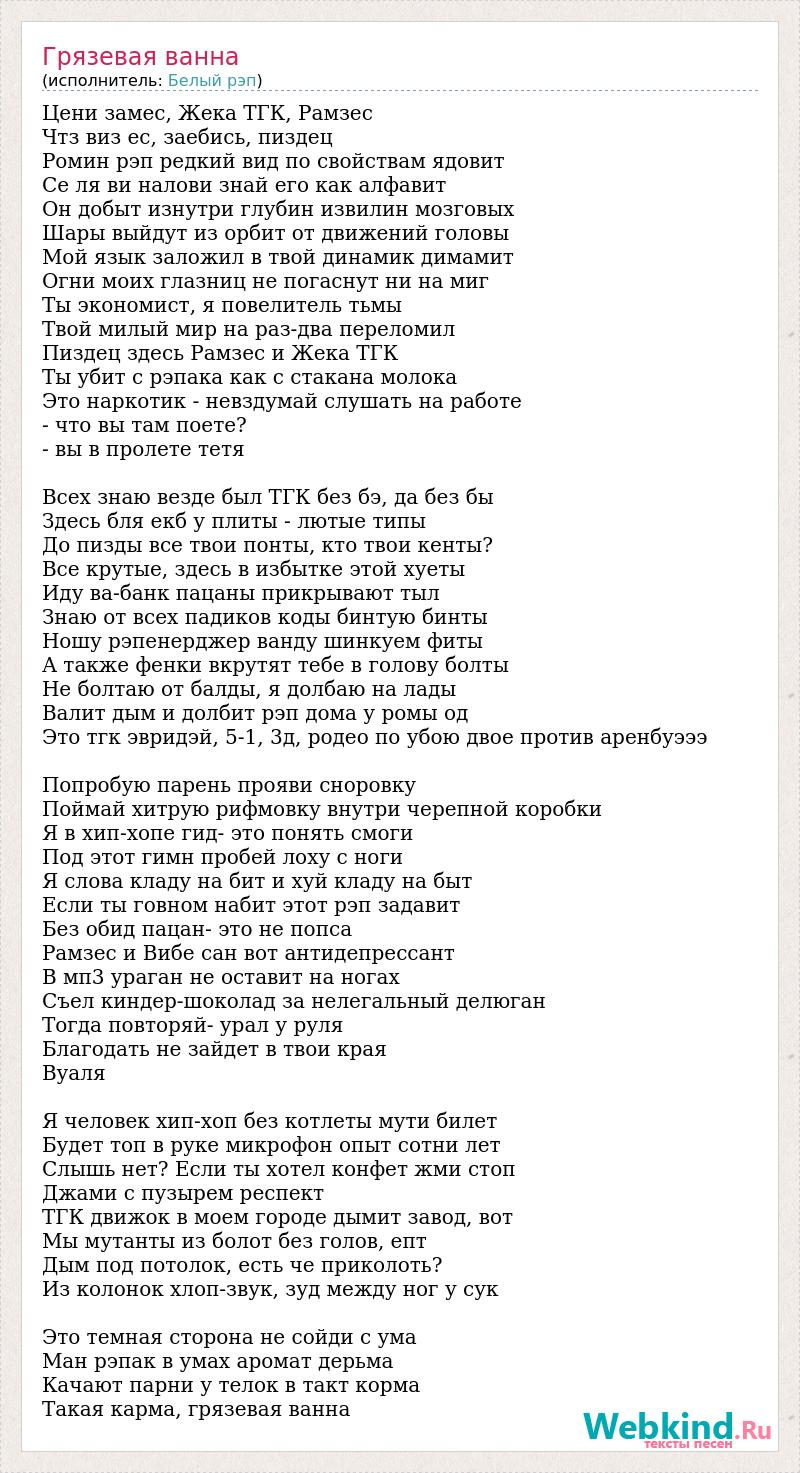 Цени замес, Жека ТГК, Рамзес Чтз виз ес, заебись, пиздец Ромин рэп редкий вид по свойствам ядовит Се ля ви налови знай его как алфавит Он добыт изнутри глубин извилин мозговых Шары выйдут из орбит от движений головы Мой язык заложил в твой динамик димамит Огни моих глазниц не погаснут ни на миг Ты экономист, я повелитель тьмы Твой милый мир на раз-два переломил Пиздец здесь Рамзес и Жека ТГК Ты убит с рэпака как с стакана молока Это наркотик - невздумай слушать на работе - что вы там поете? - вы в пролете тетя Всех знаю везде был ТГК без бэ, да без бы Здесь бля екб у плиты - лютые типы До пизды все твои понты, кто твои кенты? Все крутые, здесь в избытке этой хуеты Иду ва-банк пацаны прикрывают тыл Знаю от всех падиков коды бинтую бинты Ношу рэпенерджер ванду шинкуем фиты А также фенки вкрутят тебе в голову болты Не болтаю от балды, я долбаю на лады Валит дым и долбит рэп дома у ромы од Это тгк эвридэй, 5-1, 3д, родео по убою двое против аренбуэээ Попробую парень прояви сноровку Поймай хитрую рифмовку внутри черепной коробки Я в хип-хопе гид- это понять смоги Под этот гимн пробей лоху с ноги Я слова кладу на бит и хуй кладу на быт Если ты говном набит этот рэп задавит Без обид пацан- это не попса Рамзес и Вибе сан вот антидепрессант В мп3 ураган не оставит на ногах Съел киндер-шоколад за нелегальный делюган Тогда повторяй- урал у руля Благодать не зайдет в твои края Вуаля Я человек хип-хоп без котлеты мути билет Будет топ в руке микрофон опыт сотни лет Слышь нет? Если ты хотел конфет жми стоп Джами с пузырем респект ТГК движок в моем городе дымит завод, вот Мы мутанты из болот без голов, епт Дым под потолок, есть че приколоть? Из колонок хлоп-звук, зуд между ног у сук Это темная сторона не сойди с ума Ман рэпак в умах аромат дерьма Качают парни у телок в такт корма Такая карма, грязевая ванна