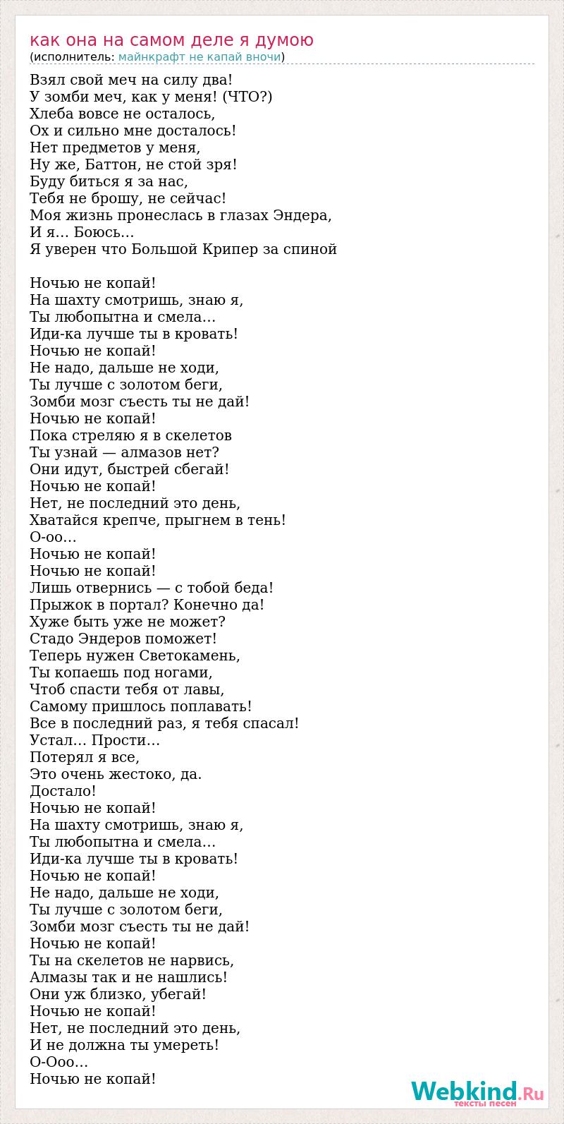 Взял свой меч на силу два! У зомби меч, как у меня! (ЧТО?) Хлеба вовсе не осталось, Ох и сильно мне досталось! Нет предметов у меня, Ну же, Баттон, не стой зря! Буду биться я за нас, Тебя не брошу, не сейчас! Моя жизнь пронеслась в глазах Эндера, И я… Боюсь… Я уверен что Большой Крипер за спиной Ночью не копай! На шахту смотришь, знаю я, Ты любопытна и смела… Иди-ка лучше ты в кровать! Ночью не копай! Не надо, дальше не ходи, Ты лучше с золотом беги, Зомби мозг съесть ты не дай! Ночью не копай! Пока стреляю я в скелетов Ты узнай — алмазов нет? Они идут, быстрей сбегай! Ночью не копай! Нет, не последний это день, Хватайся крепче, прыгнем в тень! О-оо… Ночью не копай! Ночью не копай! Лишь отвернись — с тобой беда! Прыжок в портал? Конечно да! Хуже быть уже не может? Стадо Эндеров поможет! Теперь нужен Светокамень, Ты копаешь под ногами, Чтоб спасти тебя от лавы, Самому пришлось поплавать! Все в последний раз, я тебя спасал! Устал… Прости… Потерял я все, Это очень жестоко, да. Достало! Ночью не копай! На шахту смотришь, знаю я, Ты любопытна и смела… Иди-ка лучше ты в кровать! Ночью не копай! Не надо, дальше не ходи, Ты лучше с золотом беги, Зомби мозг съесть ты не дай! Ночью не копай! Ты на скелетов не нарвись, Алмазы так и не нашлись! Они уж близко, убегай! Ночью не копай! Нет, не последний это день, И не должна ты умереть! О-Ооо… Ночью не копай!