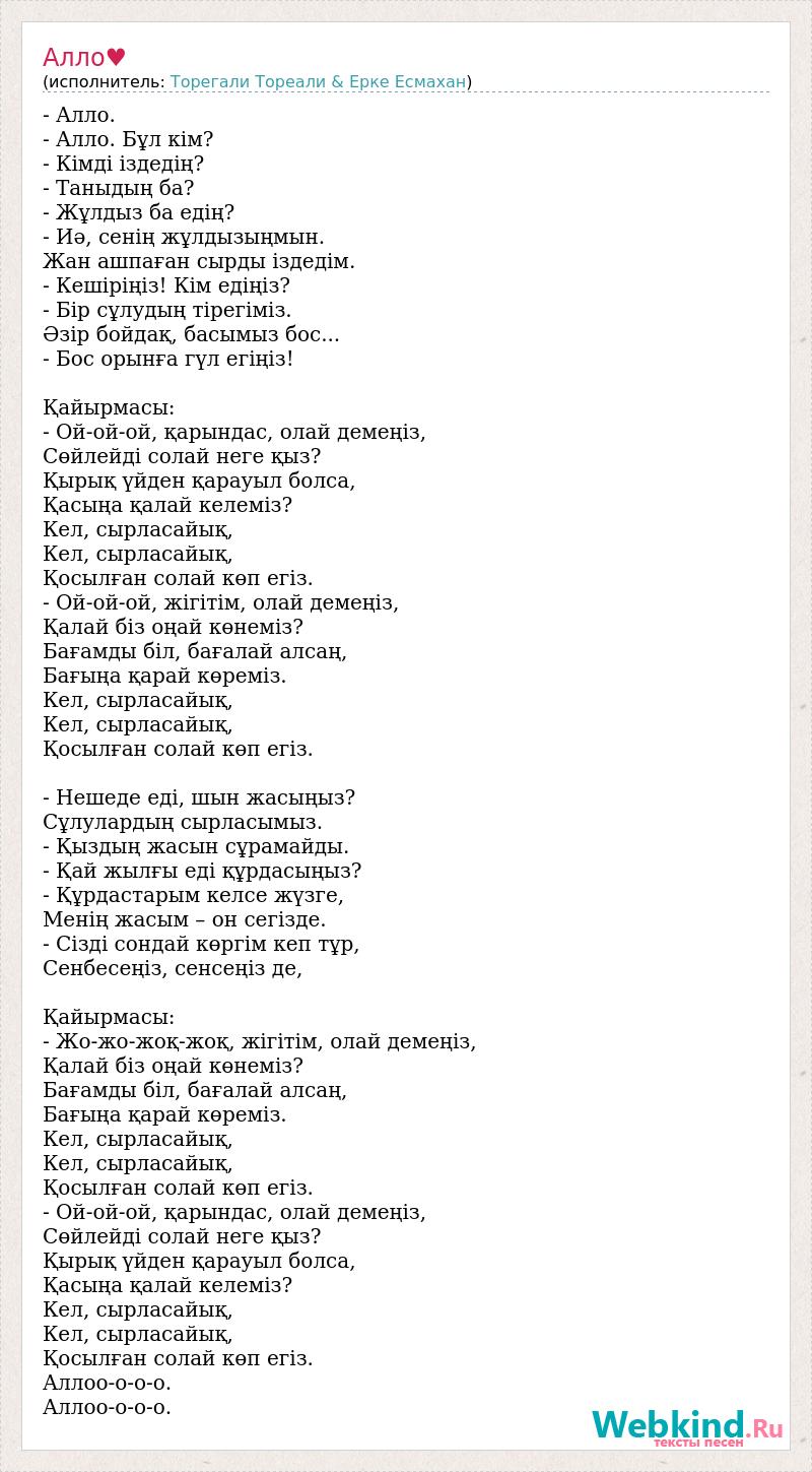 - Алло. - Алло. Бұл кім? - Кімді іздедің? - Таныдың ба? - Жұлдыз ба едің? - Иə, сенің жұлдызыңмын. Жан ашпаған сырды іздедім. - Кешіріңіз! Кім едіңіз? - Бір сұлудың тірегіміз. Əзір бойдақ, басымыз бос... - Бос орынға гүл егіңіз! Қайырмасы: - Ой-ой-ой, қарындас, олай демеңіз, Сөйлейді солай неге қыз? Қырық үйден қарауыл болса, Қасыңа қалай келеміз? Кел, сырласайық, Кел, сырласайық, Қосылған солай көп егіз. - Ой-ой-ой, жігітім, олай демеңіз, Қалай біз оңай көнеміз? Бағамды біл, бағалай алсаң, Бағыңа қарай көреміз. Кел, сырласайық, Кел, сырласайық, Қосылған солай көп егіз. - Нешеде еді, шын жасыңыз? Сұлулардың сырласымыз. - Қыздың жасын сұрамайды. - Қай жылғы еді құрдасыңыз? - Құрдастарым келсе жүзге, Менің жасым – он сегізде. - Сізді сондай көргім кеп тұр, Сенбесеңіз, сенсеңіз де, Қайырмасы: - Жо-жо-жоқ-жоқ, жігітім, олай демеңіз, Қалай біз оңай көнеміз? Бағамды біл, бағалай алсаң, Бағыңа қарай көреміз. Кел, сырласайық, Кел, сырласайық, Қосылған солай көп егіз. - Ой-ой-ой, қарындас, олай демеңіз, Сөйлейді солай неге қыз? Қырық үйден қарауыл болса, Қасыңа қалай келеміз? Кел, сырласайық, Кел, сырласайық, Қосылған солай көп егіз. Аллоо-о-о-о. Аллоо-о-о-о.