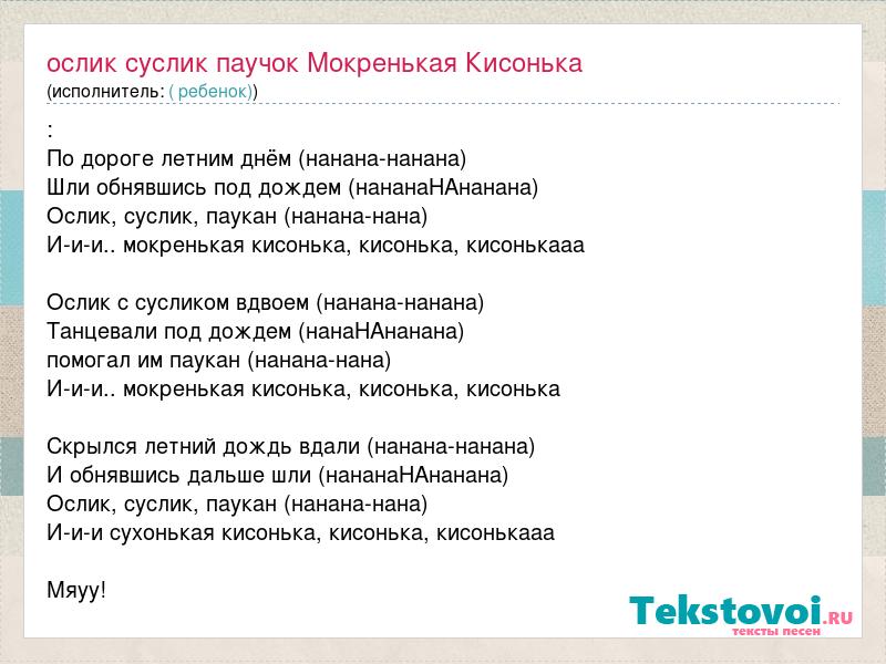 : По дороге летним днём (нанана-нанана) Шли обнявшись под дождем (нананаНАнанана) Ослик, суслик, паукан (нанана-нана) И-и-и.. мокренькая кисонька, кисонька, кисонькааа Ослик с сусликом вдвоем (нанана-нанана) Танцевали под дождем (нанаНАнанана) помогал им паукан (нанана-нана) И-и-и.. мокренькая кисонька, кисонька, кисонька Скрылся летний дождь вдали (нанана-нанана) И обнявшись дальше шли (нананаНАнанана) Ослик, суслик, паукан (нанана-нана) И-и-и сухонькая кисонька, кисонька, кисонькааа Мяуу!