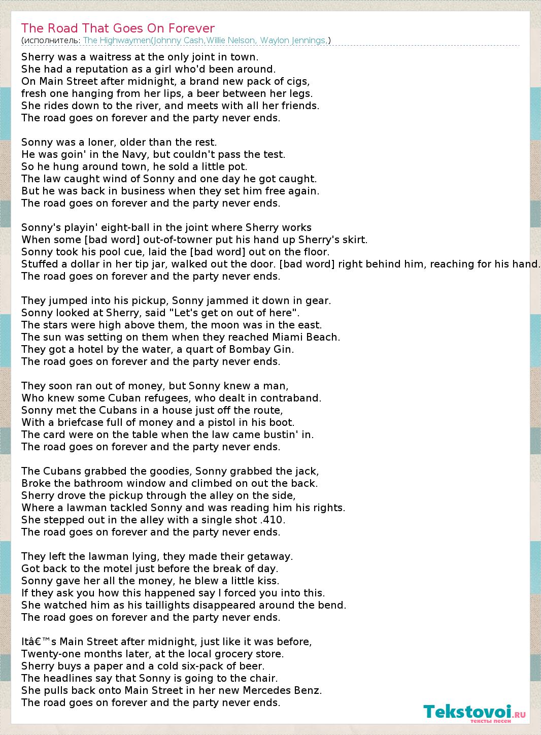 Sherry was a waitress at the only joint in town. She had a reputation as a girl who'd been around. On Main Street after midnight, a brand new pack of cigs, fresh one hanging from her lips, a beer between her legs. She rides down to the river, and meets with all her friends. The road goes on forever and the party never ends. Sonny was a loner, older than the rest. He was goin' in the Navy, but couldn't pass the test. So he hung around town, he sold a little pot. The law caught wind of Sonny and one day he got caught. But he was back in business when they set him free again. The road goes on forever and the party never ends. Sonny's playin' eight-ball in the joint where Sherry works When some [bad word] out-of-towner put his hand up Sherry's skirt. Sonny took his pool cue, laid the [bad word] out on the floor. Stuffed a dollar in her tip jar, walked out the door. [bad word] right behind him, reaching for his hand. The road goes on forever and the party never ends. They jumped into his pickup, Sonny jammed it down in gear. Sonny looked at Sherry, said "Let's get on out of here". The stars were high above them, the moon was in the east. The sun was setting on them when they reached Miami Beach. They got a hotel by the water, a quart of Bombay Gin. The road goes on forever and the party never ends. They soon ran out of money, but Sonny knew a man, Who knew some Cuban refugees, who dealt in contraband. Sonny met the Cubans in a house just off the route, With a briefcase full of money and a pistol in his boot. The card were on the table when the law came bustin' in. The road goes on forever and the party never ends. The Cubans grabbed the goodies, Sonny grabbed the jack, Broke the bathroom window and climbed on out the back. Sherry drove the pickup through the alley on the side, Where a lawman tackled Sonny and was reading him his rights. She stepped out in the alley with a single shot .410. The road goes on forever and the party never ends. They left the lawman lying, they made their getaway. Got back to the motel just before the break of day. Sonny gave her all the money, he blew a little kiss. If they ask you how this happened say I forced you into this. She watched him as his taillights disappeared around the bend. The road goes on forever and the party never ends. It’s Main Street after midnight, just like it was before, Twenty-one months later, at the local grocery store. Sherry buys a paper and a cold six-pack of beer. The headlines say that Sonny is going to the chair. She pulls back onto Main Street in her new Mercedes Benz. The road goes on forever and the party never ends.