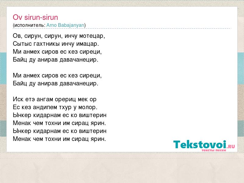 Ов, сирун, сирун, инчу мотецар, Сытыс гахтникы инчу имацар. Ми анмех сиров ес кез сиреци, Байц ду анирав давачанецир. Ми анмех сиров ес кез сиреци, Байц ду анирав давачанецир. Иск етэ ангам орериц мек ор Ес кез андипем тхур у молор. Ынкер кидарнам ес ко виштерин Менак чем тохни им сирац ярин. Ынкер кидарнам ес ко виштерин Менак чем тохни им сирац ярин.