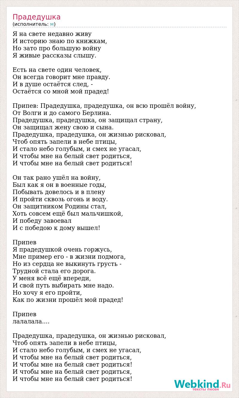 Я на свете недавно живу И историю знаю по книжкам, Но зато про большую войну Я живые рассказы слышу. Есть на свете один человек, Он всегда говорит мне правду. И в душе остаётся след, - Остаётся со мной мой прадед! Припев: Прадедушка, прадедушка, он всю прошёл войну, От Волги и до самого Берлина. Прадедушка, прадедушка, он защищал страну, Он защищал жену свою и сына. Прадедушка, прадедушка, он жизнью рисковал, Чтоб опять запели в небе птицы, И стало небо голубым, и смех не угасал, И чтобы мне на белый свет родиться, И чтобы мне на белый свет родиться! Он так рано ушёл на войну, Был как я он в военные годы, Побывать довелось и в плену И пройти сквозь огонь и воду. Он защитником Родины стал, Хоть совсем ещё был мальчишкой, И победу завоевал И с победою к дому вышел! Припев Я прадедушкой очень горжусь, Мне пример его - в жизни подмога, Но из сердца не выкинуть грусть - Трудной стала его дорога. У меня всё ещё впереди, И свой путь выбирать мне надо. Но хочу я его пройти, Как по жизни прошёл мой прадед! Припев лалалала.... Прадедушка, прадедушка, он жизнью рисковал, Чтоб опять запели в небе птицы, И стало небо голубым, и смех не угасал, И чтобы мне на белый свет родиться, И чтобы мне на белый свет родиться! И чтобы мне на белый свет родиться, И чтобы мне на белый свет родиться!