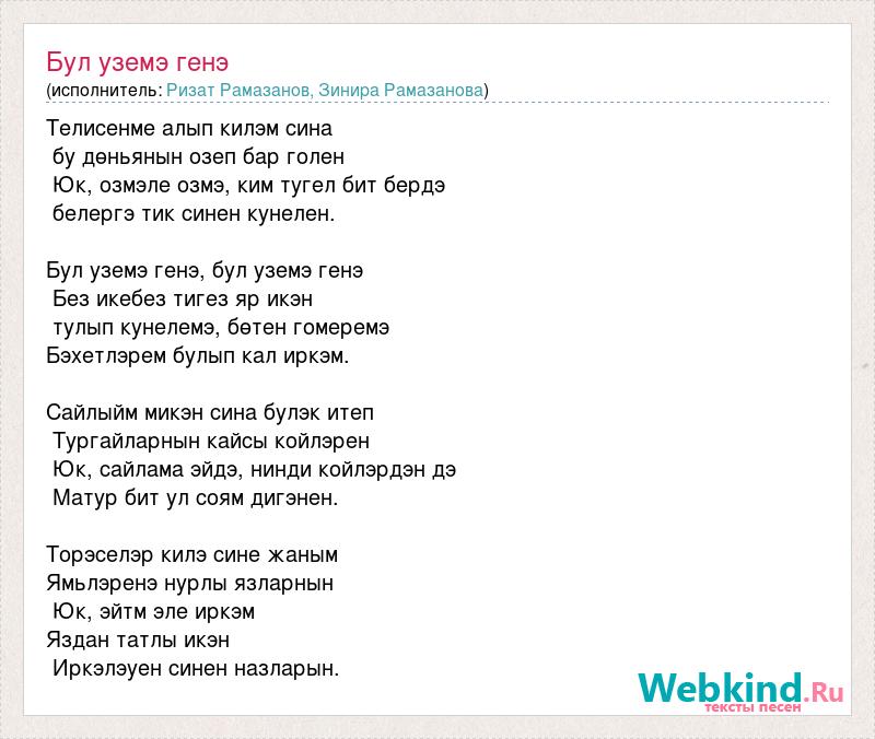 Телисенме алып килэм сина бу дөньянын озеп бар голен Юк, озмэле озмэ, ким тугел бит бердэ белергэ тик синен кунелен. Бул уземэ генэ, бул уземэ генэ Без икебез тигез яр икэн тулып кунелемэ, бөтен гомеремэ Бэхетлэрем булып кал иркэм. Сайлыйм микэн сина булэк итеп Тургайларнын кайсы койлэрен Юк, сайлама эйдэ, нинди койлэрдэн дэ Матур бит ул соям дигэнен. Торэселэр килэ сине жаным Ямьлэренэ нурлы язларнын Юк, эйтм эле иркэм Яздан татлы икэн Иркэлэуен синен назларын.