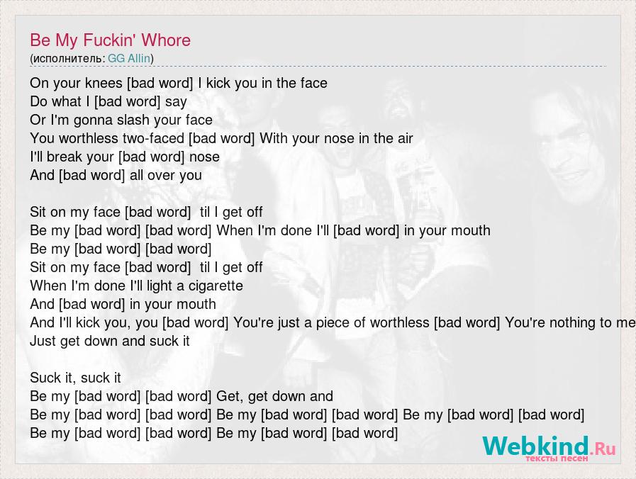 On your knees [bad word] I kick you in the face Do what I [bad word] say Or I'm gonna slash your face You worthless two-faced [bad word] With your nose in the air I'll break your [bad word] nose And [bad word] all over you Sit on my face [bad word] til I get off Be my [bad word] [bad word] When I'm done I'll [bad word] in your mouth Be my [bad word] [bad word] Sit on my face [bad word] til I get off When I'm done I'll light a cigarette And [bad word] in your mouth And I'll kick you, you [bad word] You're just a piece of worthless [bad word] You're nothing to me Just get down and suck it Suck it, suck it Be my [bad word] [bad word] Get, get down and Be my [bad word] [bad word] Be my [bad word] [bad word] Be my [bad word] [bad word] Be my [bad word] [bad word] Be my [bad word] [bad word]