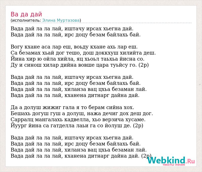 Вада дай ла ла лай, иштачу ирсах хьегна дай. Вада дай ла ла лай, ирс доцу безам байлахь бай. Вогу кхане аса лар еш, воьду кхане ахь лар еш. Са безамах хьай дог тешо, дош доккхуш хилийта деш. Йина хир ю ойла хийла, яц хьоьл таьхьа йисна со. Ду и синош хилар дийна вовше цара туьйсу го. (2р) Вада дай ла ла лай, иштачу ирсах хьегна дай. Вада дай ла ла лай, ирс доцу безам байлахь бай. Вада дай ла ла лай, хиланза вац цхьа безаман лай. Вада дай ла ла лай, кханена дитнарг дайна дай. Да а долуш жижиг гала я то берам сийна хох. Бешахь догуш гуш а долуш, нажа дечиг дох деш дог. Сарралц мангалахь кадвелла, хьо верзича хусаме. Йуург йина са гатделла лаьи га со йолуш де. (2р) Вада дай ла ла лай, иштачу ирсах хьегна дай. Вада дай ла ла лай, ирс доцу безам байлахь бай. Вада дай ла ла лай, хиланза вац цхьа безаман лай. Вада дай ла ла лай, кханена дитнарг дайна дай. (2р)