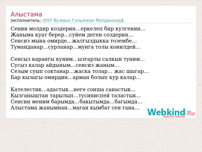 Сенин молдир коздерин…еркелеп бир кулгенин… Жаныма куат берер…суйем деген создерин… Сенсиз мына омирде…жалгыздыкка тозембе… Туманданар…сурланар…мунга толы конилдей… Сенсыз карангы куним…ызгарлы салкын туним... Сусыз калар айдыным…сенсиз жаным… Сезым суып соктанар…жаска толар… жас шыгар… Бар кызыгы омирдин…арман болып кур калар… Кателестик…адастык…неге сонша санастык… Кызганыштан тарылып…тусиниспей таластык… Сенсин меним барымда…бакытымда…багымда… Алыстама жанымнан…маган кымбат сен гана…