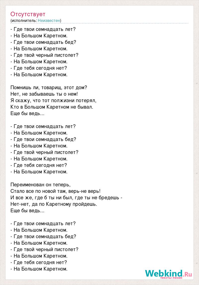 - Где твои семнадцать лет? - На Большом Каретном. - Где твои семнадцать бед? - На Большом Каретном. - Где твой черный пистолет? - На Большом Каретном. - Где тебя сегодня нет? - На Большом Каретном. Помнишь ли, товарищ, этот дом? Нет, не забываешь ты о нем! Я скажу, что тот полжизни потерял, Кто в Большом Каретном не бывал. Еще бы ведь... - Где твои семнадцать лет? - На Большом Каретном. - Где твои семнадцать бед? - На Большом Каретном. - Где твой черный пистолет? - На Большом Каретном. - Где тебя сегодня нет? - На Большом Каретном. Переименован он теперь, Стало все по новой там, верь-не верь! И все же, где б ты ни был, где ты не бредешь - Нет-нет, да по Каретному пройдешь. Еще бы ведь... - Где твои семнадцать лет? - На Большом Каретном. - Где твои семнадцать бед? - На Большом Каретном. - Где твой черный пистолет? - На Большом Каретном. - Где тебя сегодня нет? - На Большом Каретном.