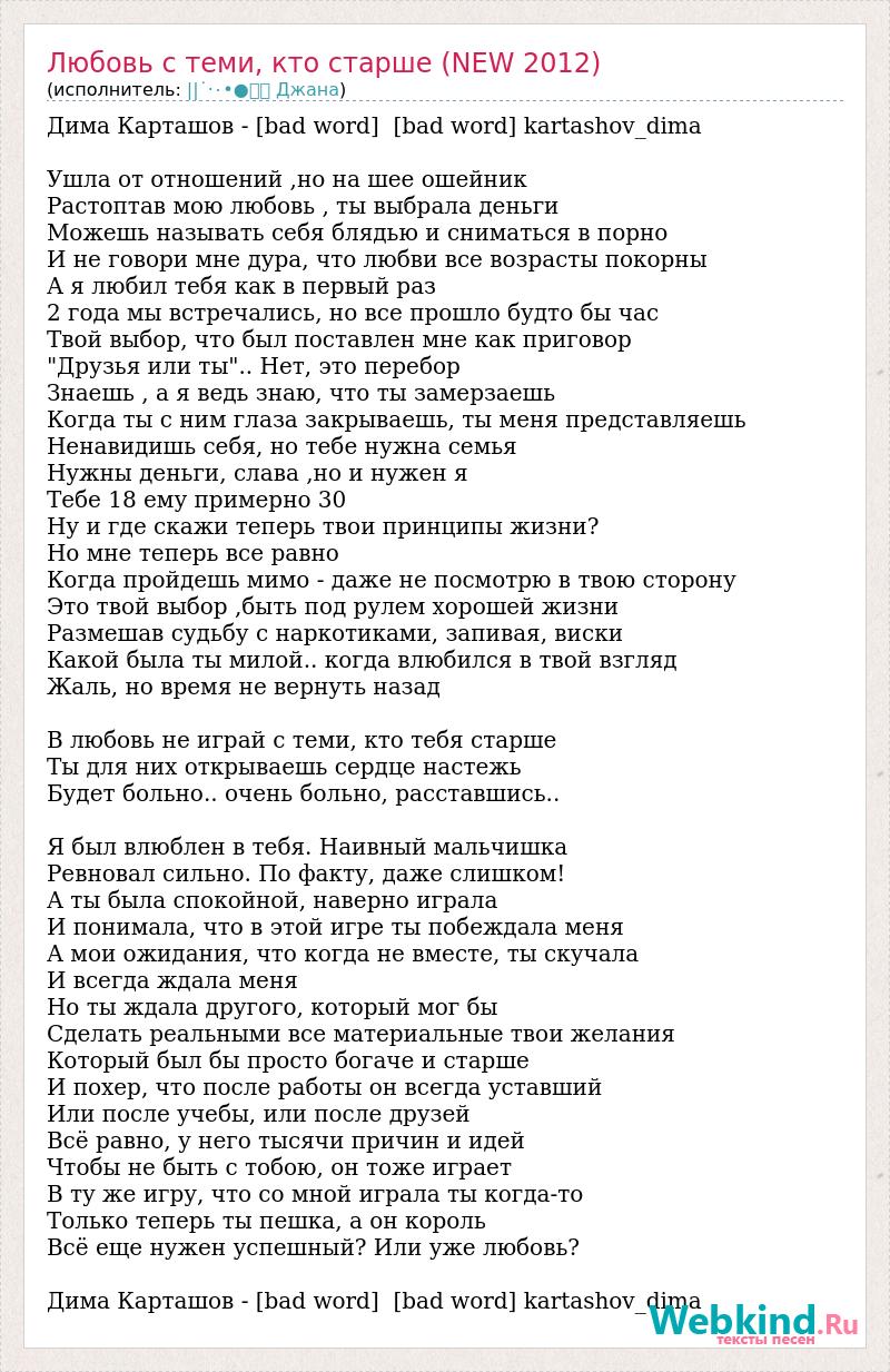 Дима Карташов - [bad word] [bad word] kartashov_dima Ушла от отношений ,но на шее ошейник Растоптав мою любовь , ты выбрала деньги Можешь называть себя блядью и сниматься в порно И не говори мне дура, что любви все возрасты покорны А я любил тебя как в первый раз 2 года мы встречались, но все прошло будто бы час Твой выбор, что был поставлен мне как приговор "Друзья или ты".. Нет, это перебор Знаешь , а я ведь знаю, что ты замерзаешь Когда ты с ним глаза закрываешь, ты меня представляешь Ненавидишь себя, но тебе нужна семья Нужны деньги, слава ,но и нужен я Тебе 18 ему примерно 30 Ну и где скажи теперь твои принципы жизни? Но мне теперь все равно Когда пройдешь мимо - даже не посмотрю в твою сторону Это твой выбор ,быть под рулем хорошей жизни Размешав судьбу с наркотиками, запивая, виски Какой была ты милой.. когда влюбился в твой взгляд Жаль, но время не вернуть назад В любовь не играй с теми, кто тебя старше Ты для них открываешь сердце настежь Будет больно.. очень больно, расставшись.. Я был влюблен в тебя. Наивный мальчишка Ревновал сильно. По факту, даже слишком! А ты была спокойной, наверно играла И понимала, что в этой игре ты побеждала меня А мои ожидания, что когда не вместе, ты скучала И всегда ждала меня Но ты ждала другого, который мог бы Сделать реальными все материальные твои желания Который был бы просто богаче и старше И похер, что после работы он всегда уставший Или после учебы, или после друзей Всё равно, у него тысячи причин и идей Чтобы не быть с тобою, он тоже играет В ту же игру, что со мной играла ты когда-то Только теперь ты пешка, а он король Всё еще нужен успешный? Или уже любовь? Дима Карташов - [bad word] [bad word] kartashov_dima