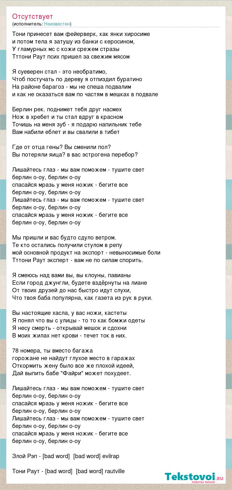 Тони принесет вам фейерверк, как янки хиросиме и потом тела я затушу из банки с керосином, У гламурных мс с кожи срежем стразы Тттони Раут псих пришел за свежим мясом Я суеверен стал - это необратимо, Чтоб постучать по дереву я отпиздил буратино На районе барагоз - мы не спеша подвалим и как не оказаться вам по частям в мешках в подвале Берлин рек. поднимет тебя друг насмех Нож в хребет и ты стал вдруг в красном Точишь на меня зуб - я подарю напильник тебе Вам набили еблет и вы свалили в тибет Где от отца гены? Вы сменили пол? Вы потеряли яица? в вас эстрогена перебор? Лишайтесь глаз - мы вам поможем - тушите свет берлин о-оу, берлин о-оу спасайся мразь у меня ножик - бегите все берлин о-оу, берлин о-оу Лишайтесь глаз - мы вам поможем - тушите свет берлин о-оу, берлин о-оу спасайся мразь у меня ножик - бегите все берлин о-оу, берлин о-оу Мы пришли и вас будто сдуло ветром. Те кто остались получили стулом в репу мой основной продукт на экспорт - невыносимые боли Тттони Раут эксперт - вам не по силам спорить. Я смеюсь над вами вы, вы клоуны, павианы Если город джунгли, будете вздёрнуты на лиане От твоих друзей до нас быстро идут слухи, Что твоя баба популярна, как газета из рук в руки. Вы настоящие хасла, у вас ножи, кастеты Я понял что вы с улицы - то то как бомжи одеты Я несу смерть - открывай мешок и сдохни В моих жилах нет крови - течет ток в них. 78 номера, ты вместо багажа горожане не найдут глухое место в гаражах Откормить жену было все же плохой идеей, Дай выпить бабе "Файри" может похудеет. Лишайтесь глаз - мы вам поможем - тушите свет берлин о-оу, берлин о-оу спасайся мразь у меня ножик - бегите все берлин о-оу, берлин о-оу Лишайтесь глаз - мы вам поможем - тушите свет берлин о-оу, берлин о-оу спасайся мразь у меня ножик - бегите все берлин о-оу, берлин о-оу Злой Рэп - [bad word] [bad word] evilrap Тони Раут - [bad word] [bad word] rautville
