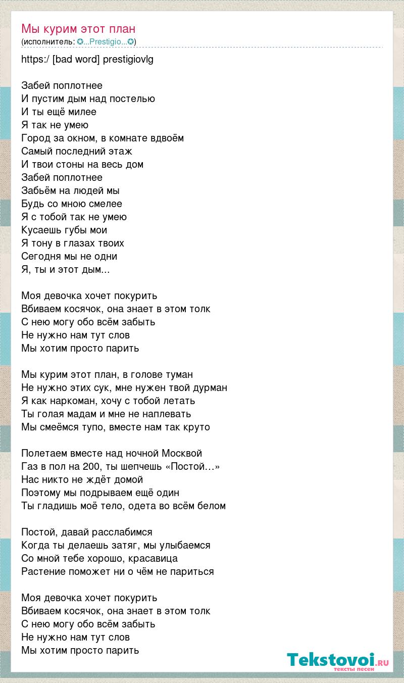 https:/ [bad word] prestigiovlg Забей поплотнее И пустим дым над постелью И ты ещё милее Я так не умею Город за окном, в комнате вдвоём Самый последний этаж И твои стоны на весь дом Забей поплотнее Забьём на людей мы Будь со мною смелее Я с тобой так не умею Кусаешь губы мои Я тону в глазах твоих Сегодня мы не одни Я, ты и этот дым... Моя девочка хочет покурить Вбиваем косячок, она знает в этом толк С нею могу обо всём забыть Не нужно нам тут слов Мы хотим просто парить Мы курим этот план, в голове туман Не нужно этих сук, мне нужен твой дурман Я как наркоман, хочу с тобой летать Ты голая мадам и мне не наплевать Мы смеёмся тупо, вместе нам так круто Полетаем вместе над ночной Москвой Газ в пол на 200, ты шепчешь «Постой…» Нас никто не ждёт домой Поэтому мы подрываем ещё один Ты гладишь моё тело, одета во всём белом Постой, давай расслабимся Когда ты делаешь затяг, мы улыбаемся Со мной тебе хорошо, красавица Растение поможет ни о чём не париться Моя девочка хочет покурить Вбиваем косячок, она знает в этом толк С нею могу обо всём забыть Не нужно нам тут слов Мы хотим просто парить
