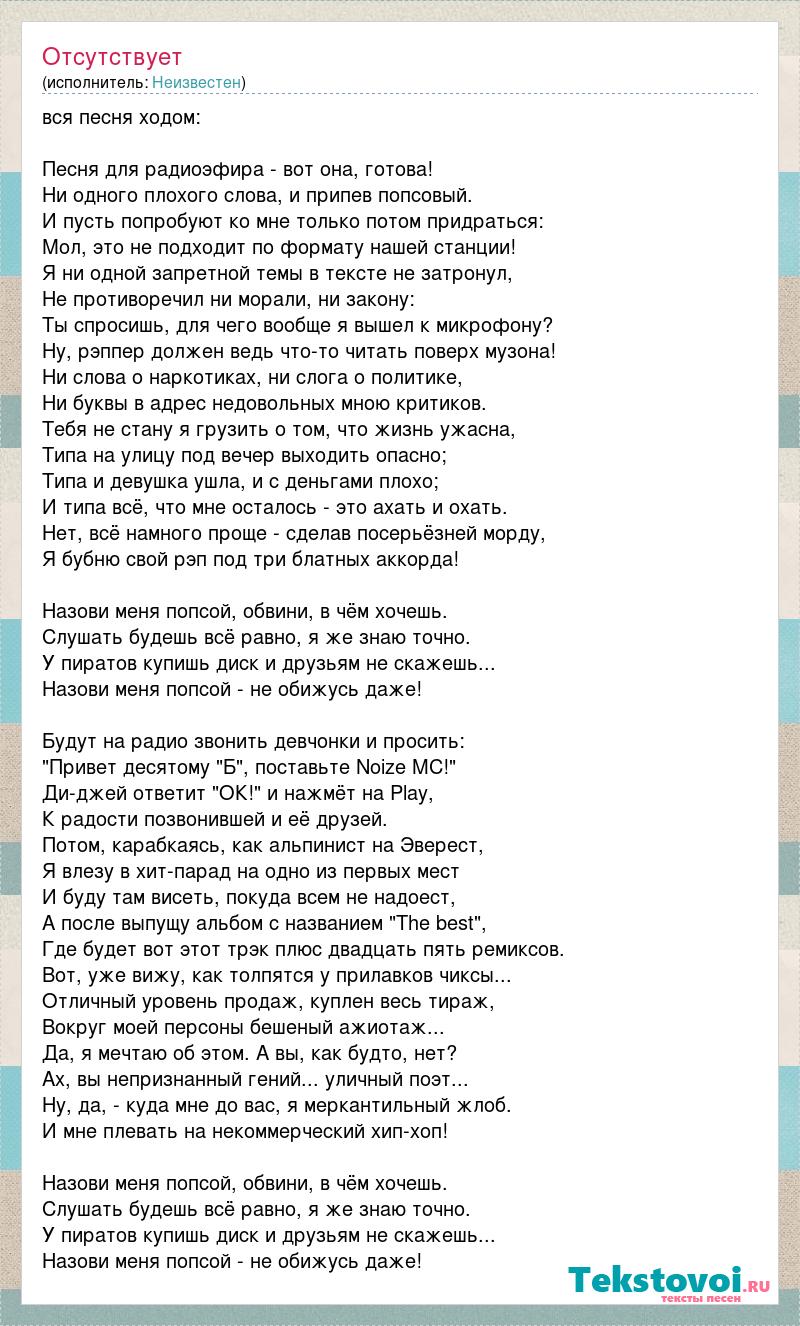 вся песня ходом: Песня для радиоэфира - вот она, готова! Ни одного плохого слова, и припев попсовый. И пусть попробуют ко мне только потом придраться: Мол, это не подходит по формату нашей станции! Я ни одной запретной темы в тексте не затронул, Не противоречил ни морали, ни закону: Ты спросишь, для чего вообще я вышел к микрофону? Ну, рэппер должен ведь что-то читать поверх музона! Ни слова о наркотиках, ни слога о политике, Ни буквы в адрес недовольных мною критиков. Тебя не стану я грузить о том, что жизнь ужасна, Типа на улицу под вечер выходить опасно; Типа и девушка ушла, и с деньгами плохо; И типа всё, что мне осталось - это ахать и охать. Нет, всё намного проще - сделав посерьёзней морду, Я бубню свой рэп под три блатных аккорда! Назови меня попсой, обвини, в чём хочешь. Слушать будешь всё равно, я же знаю точно. У пиратов купишь диск и друзьям не скажешь... Назови меня попсой - не обижусь даже! Будут на радио звонить девчонки и просить: "Привет десятому "Б", поставьте Noize MC!" Ди-джей ответит "ОК!" и нажмёт на Play, К радости позвонившей и её друзей. Потом, карабкаясь, как альпинист на Эверест, Я влезу в хит-парад на одно из первых мест И буду там висеть, покуда всем не надоест, А после выпущу альбом с названием "The best", Где будет вот этот трэк плюс двадцать пять ремиксов. Вот, уже вижу, как толпятся у прилавков чиксы... Отличный уровень продаж, куплен весь тираж, Вокруг моей персоны бешеный ажиотаж... Да, я мечтаю об этом. А вы, как будто, нет? Ах, вы непризнанный гений... уличный поэт... Ну, да, - куда мне до вас, я меркантильный жлоб. И мне плевать на некоммерческий хип-хоп! Назови меня попсой, обвини, в чём хочешь. Слушать будешь всё равно, я же знаю точно. У пиратов купишь диск и друзьям не скажешь... Назови меня попсой - не обижусь даже!