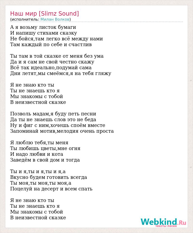 А я возьму листок бумаги И напишу стихами сказку Не бойся,там легко всё между нами Там каждый по себе и счастлив Ты там в той сказке от меня без ума Да и я сам не свой честно скажу Всё так идеально,подумай сама Дни летят,мы смеёмся,я на тебя гляжу Я не знаю кто ты Ты не знаешь кто я Мы знакомы с тобой В неизвестной сказке Позволь мадам,я буду петь песни Да ты не знаешь слов это не беда Ну и фиг с ним,хочешь споём вместе Запоминай мотив,мелодия очень проста Я люблю тебя,ты меня Ты любишь цветы,мне огня И надо любви и кота Заведём в свой дом и тогда Ты и я,ты и я,ты и я,а Вкусно будем готовить всегда Ты моя,ты моя,ты моя,а Поцелуй на десерт и всем спать Я не знаю кто ты Ты не знаешь кто я Мы знакомы с тобой В неизвестной сказке