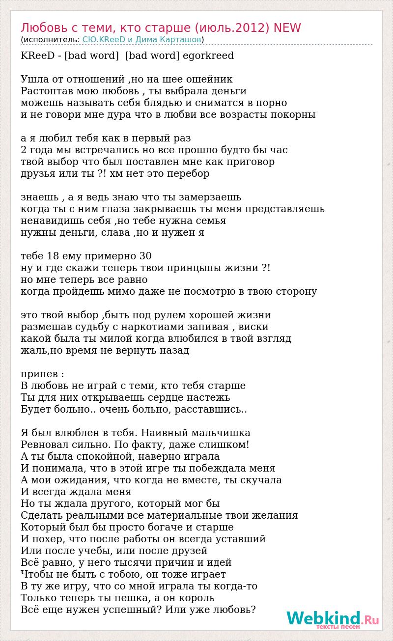 KReeD - [bad word] [bad word] egorkreed Ушла от отношений ,но на шее ошейник Растоптав мою любовь , ты выбрала деньги можешь называть себя блядью и сниматся в порно и не говори мне дура что в любви все возрасты покорны а я любил тебя как в первый раз 2 года мы встречались но все прошло будто бы час твой выбор что был поставлен мне как приговор друзья или ты ?! хм нет это перебор знаешь , а я ведь знаю что ты замерзаешь когда ты с ним глаза закрываешь ты меня представляешь ненавидишь себя ,но тебе нужна семья нужны деньги, слава ,но и нужен я тебе 18 ему примерно 30 ну и где скажи теперь твои принцыпы жизни ?! но мне теперь все равно когда пройдешь мимо даже не посмотрю в твою сторону это твой выбор ,быть под рулем хорошей жизни размешав судьбу с наркотиами запивая , виски какой была ты милой когда влюбился в твой взгляд жаль,но время не вернуть назад припев : В любовь не играй с теми, кто тебя старше Ты для них открываешь сердце настежь Будет больно.. очень больно, расставшись.. Я был влюблен в тебя. Наивный мальчишка Ревновал сильно. По факту, даже слишком! А ты была спокойной, наверно играла И понимала, что в этой игре ты побеждала меня А мои ожидания, что когда не вместе, ты скучала И всегда ждала меня Но ты ждала другого, который мог бы Сделать реальными все материальные твои желания Который был бы просто богаче и старше И похер, что после работы он всегда уставший Или после учебы, или после друзей Всё равно, у него тысячи причин и идей Чтобы не быть с тобою, он тоже играет В ту же игру, что со мной играла ты когда-то Только теперь ты пешка, а он король Всё еще нужен успешный? Или уже любовь?