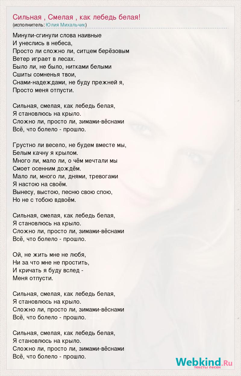 Минули-сгинули слова наивные И унеслись в небеса, Просто ли сложно ли, ситцем берёзовым Ветер играет в лесах. Было ли, не было, нитками белыми Сшиты сомненья твои, Снами-надеждами, не буду прежней я, Просто меня отпусти. Сильная, смелая, как лебедь белая, Я становлюсь на крыло. Сложно ли, просто ли, зимами-вёснами Всё, что болело - прошло. Грустно ли весело, не будем вместе мы, Белым качну я крылом. Много ли, мало ли, о чём мечтали мы Смоет осенним дождём. Мало ли, много ли, днями, тревогами Я настою на своём. Вынесу, выстою, песню свою спою, Но не с тобою вдвоём. Сильная, смелая, как лебедь белая, Я становлюсь на крыло. Сложно ли, просто ли, зимами-вёснами Всё, что болело - прошло. Ой, не жить мне не любя, Ни за что мне не простить, И кричать я буду вслед - Меня отпусти. Сильная, смелая, как лебедь белая, Я становлюсь на крыло. Сложно ли, просто ли, зимами-вёснами Всё, что болело - прошло. Сильная, смелая, как лебедь белая, Я становлюсь на крыло. Сложно ли, просто ли, зимами-вёснами Всё, что болело - прошло.