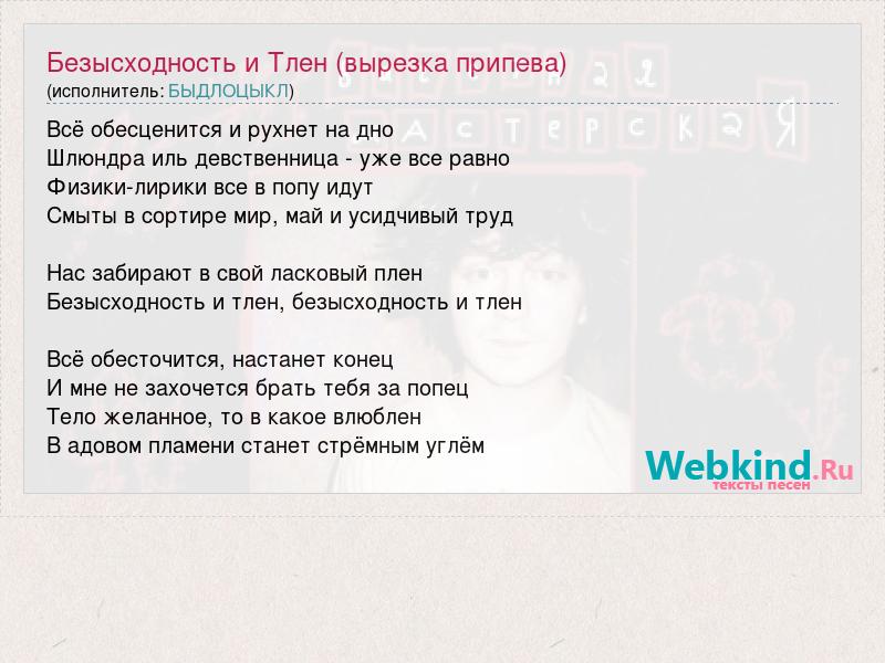 Всё обесценится и рухнет на дно Шлюндра иль девственница - уже все равно Физики-лирики все в попу идут Смыты в сортире мир, май и усидчивый труд Нас забирают в свой ласковый плен Безысходность и тлен, безысходность и тлен Всё обесточится, настанет конец И мне не захочется брать тебя за попец Тело желанное, то в какое влюблен В адовом пламени станет стрёмным углём