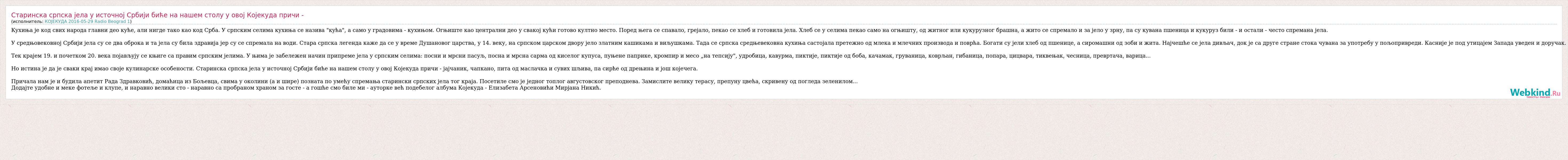 Главная→Исполнители→КОЈЕКУДА 2016-05-29 Radio Beograd 1→Старинска српска јела у источној Србији биће на нашем столу у овој Којеку