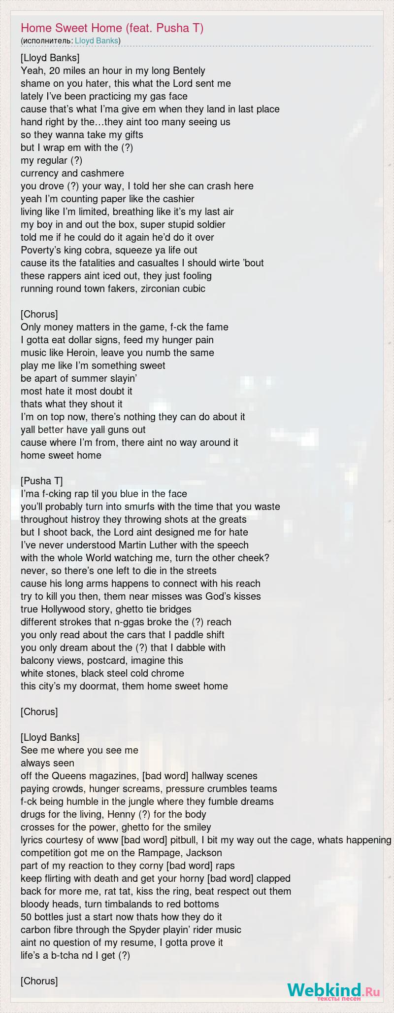 [Lloyd Banks] Yeah, 20 miles an hour in my long Bentely shame on you hater, this what the Lord sent me lately I’ve been practicing my gas face cause that’s what I’ma give em when they land in last place hand right by the…they aint too many seeing us so they wanna take my gifts but I wrap em with the (?) my regular (?) currency and cashmere you drove (?) your way, I told her she can crash here yeah I’m counting paper like the cashier living like I’m limited, breathing like it’s my last air my boy in and out the box, super stupid soldier told me if he could do it again he’d do it over Poverty’s king cobra, squeeze ya life out cause its the fatalities and casualtes I should wirte ’bout these rappers aint iced out, they just fooling running round town fakers, zirconian cubic [Chorus] Only money matters in the game, f-ck the fame I gotta eat dollar signs, feed my hunger pain music like Heroin, leave you numb the same play me like I’m something sweet be apart of summer slayin’ most hate it most doubt it thats what they shout it I’m on top now, there’s nothing they can do about it yall better have yall guns out cause where I’m from, there aint no way around it home sweet home [Pusha T] I’ma f-cking rap til you blue in the face you’ll probably turn into smurfs with the time that you waste throughout histroy they throwing shots at the greats but I shoot back, the Lord aint designed me for hate I’ve never understood Martin Luther with the speech with the whole World watching me, turn the other cheek? never, so there’s one left to die in the streets cause his long arms happens to connect with his reach try to kill you then, them near misses was God’s kisses true Hollywood story, ghetto tie bridges different strokes that n-ggas broke the (?) reach you only read about the cars that I paddle shift you only dream about the (?) that I dabble with balcony views, postcard, imagine this white stones, black steel cold chrome this city’s my doormat, them home sweet home [Chorus] [Lloyd Banks] See me where you see me always seen off the Queens magazines, [bad word] hallway scenes paying crowds, hunger screams, pressure crumbles teams f-ck being humble in the jungle where they fumble dreams drugs for the living, Henny (?) for the body crosses for the power, ghetto for the smiley lyrics courtesy of www [bad word] pitbull, I bit my way out the cage, whats happening competition got me on the Rampage, Jackson part of my reaction to they corny [bad word] raps keep flirting with death and get your horny [bad word] clapped back for more me, rat tat, kiss the ring, beat respect out them bloody heads, turn timbalands to red bottoms 50 bottles just a start now thats how they do it carbon fibre through the Spyder playin’ rider music aint no question of my resume, I gotta prove it life’s a b-tcha nd I get (?) [Chorus]