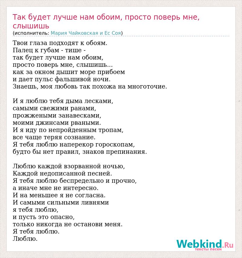 А как ты думаешь, о чем песня "Так будет лучше нам обоим, просто поверь мне, слышишь" ?