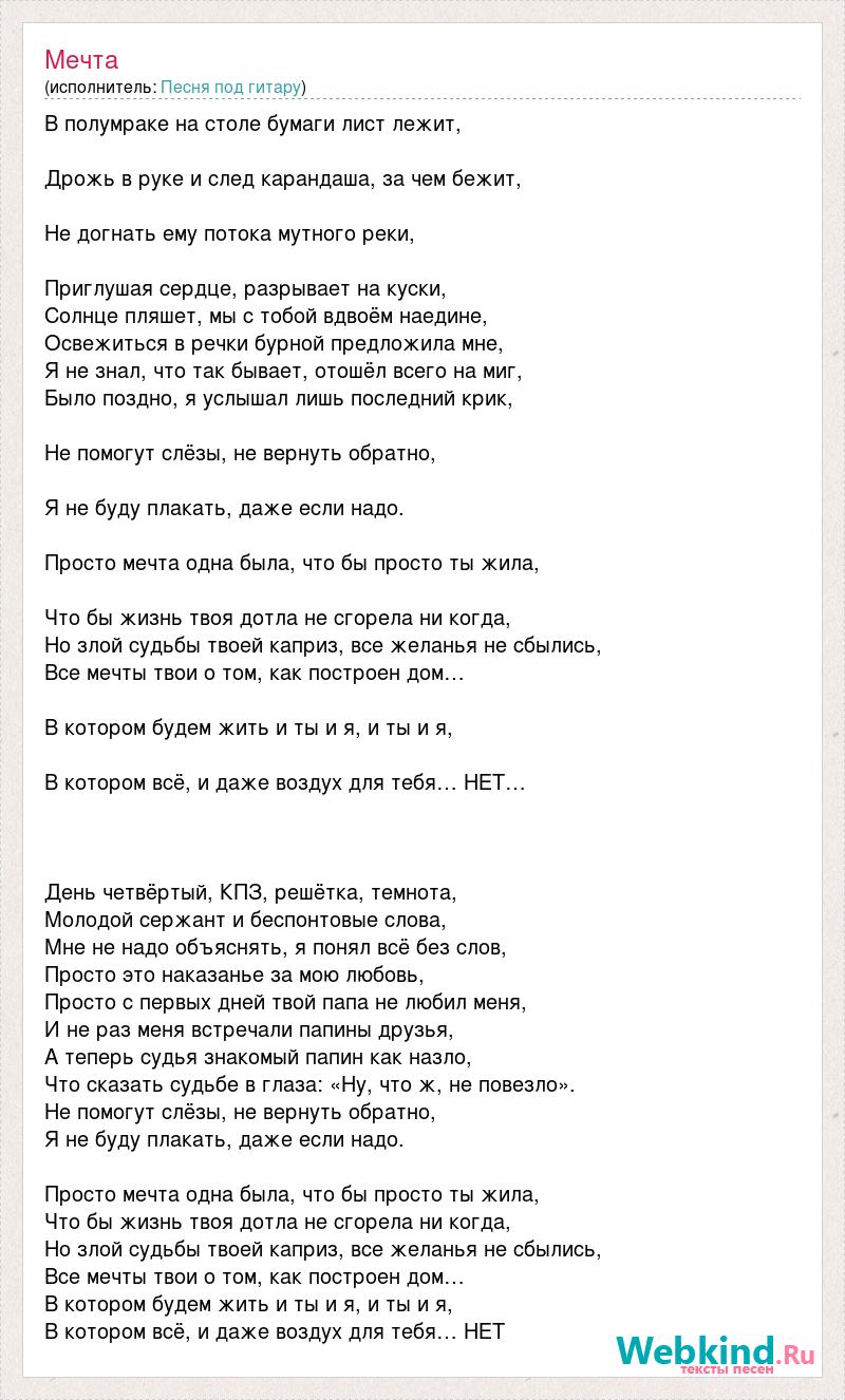 В полумраке на столе бумаги лист лежит, Дрожь в руке и след карандаша, за чем бежит, Не догнать ему потока мутного реки, Приглушая сердце, разрывает на куски, Солнце пляшет, мы с тобой вдвоём наедине, Освежиться в речки бурной предложила мне, Я не знал, что так бывает, отошёл всего на миг, Было поздно, я услышал лишь последний крик, Не помогут слёзы, не вернуть обратно, Я не буду плакать, даже если надо. Просто мечта одна была, что бы просто ты жила, Что бы жизнь твоя дотла не сгорела ни когда, Но злой судьбы твоей каприз, все желанья не сбылись, Все мечты твои о том, как построен дом… В котором будем жить и ты и я, и ты и я, В котором всё, и даже воздух для тебя… НЕТ… День четвёртый, КПЗ, решётка, темнота, Молодой сержант и беспонтовые слова, Мне не надо объяснять, я понял всё без слов, Просто это наказанье за мою любовь, Просто с первых дней твой папа не любил меня, И не раз меня встречали папины друзья, А теперь судья знакомый папин как назло, Что сказать судьбе в глаза: «Ну, что ж, не повезло». Не помогут слёзы, не вернуть обратно, Я не буду плакать, даже если надо. Просто мечта одна была, что бы просто ты жила, Что бы жизнь твоя дотла не сгорела ни когда, Но злой судьбы твоей каприз, все желанья не сбылись, Все мечты твои о том, как построен дом… В котором будем жить и ты и я, и ты и я, В котором всё, и даже воздух для тебя… НЕТ