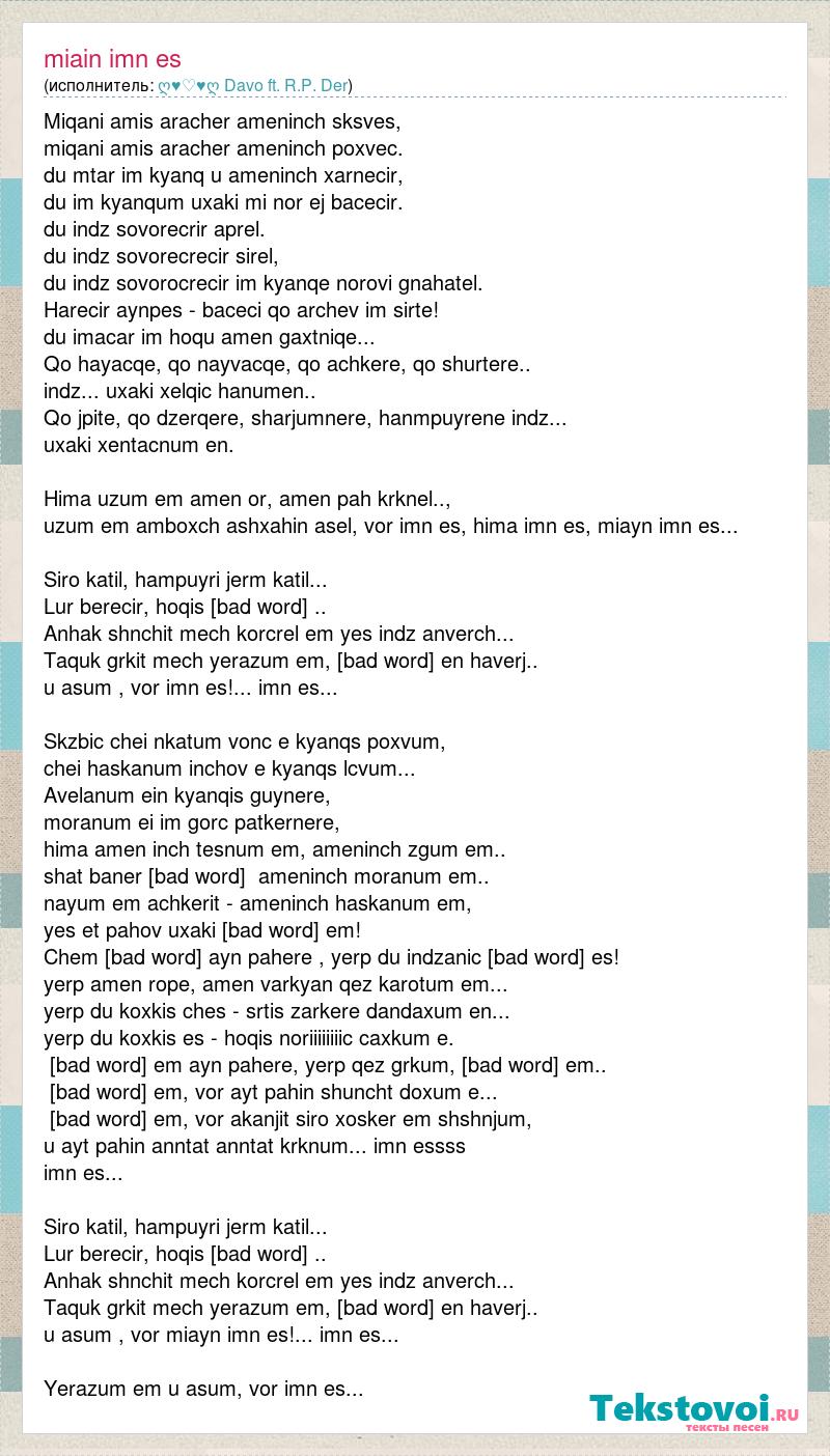 Miqani amis aracher ameninch sksves, miqani amis aracher ameninch poxvec. du mtar im kyanq u ameninch xarnecir, du im kyanqum uxaki mi nor ej bacecir. du indz sovorecrir aprel. du indz sovorecrecir sirel, du indz sovorocrecir im kyanqe norovi gnahatel. Harecir aynpes - baceci qo archev im sirte! du imacar im hoqu amen gaxtniqe... Qo hayacqe, qo nayvacqe, qo achkere, qo shurtere.. indz... uxaki xelqic hanumen.. Qo jpite, qo dzerqere, sharjumnere, hanmpuyrene indz... uxaki xentacnum en. Hima uzum em amen or, amen pah krknel.., uzum em amboxch ashxahin asel, vor imn es, hima imn es, miayn imn es... Siro katil, hampuyri jerm katil... Lur berecir, hoqis [bad word] .. Anhak shnchit mech korcrel em yes indz anverch... Taquk grkit mech yerazum em, [bad word] en haverj.. u asum , vor imn es!... imn es... Skzbic chei nkatum vonc e kyanqs poxvum, chei haskanum inchov e kyanqs lcvum... Avelanum ein kyanqis guynere, moranum ei im gorc patkernere, hima amen inch tesnum em, ameninch zgum em.. shat baner [bad word] ameninch moranum em.. nayum em achkerit - ameninch haskanum em, yes et pahov uxaki [bad word] em! Chem [bad word] ayn pahere , yerp du indzanic [bad word] es! yerp amen rope, amen varkyan qez karotum em... yerp du koxkis ches - srtis zarkere dandaxum en... yerp du koxkis es - hoqis noriiiiiiiic caxkum e. [bad word] em ayn pahere, yerp qez grkum, [bad word] em.. [bad word] em, vor ayt pahin shuncht doxum e... [bad word] em, vor akanjit siro xosker em shshnjum, u ayt pahin anntat anntat krknum... imn essss imn es... Siro katil, hampuyri jerm katil... Lur berecir, hoqis [bad word] .. Anhak shnchit mech korcrel em yes indz anverch... Taquk grkit mech yerazum em, [bad word] en haverj.. u asum , vor miayn imn es!... imn es... Yerazum em u asum, vor imn es...