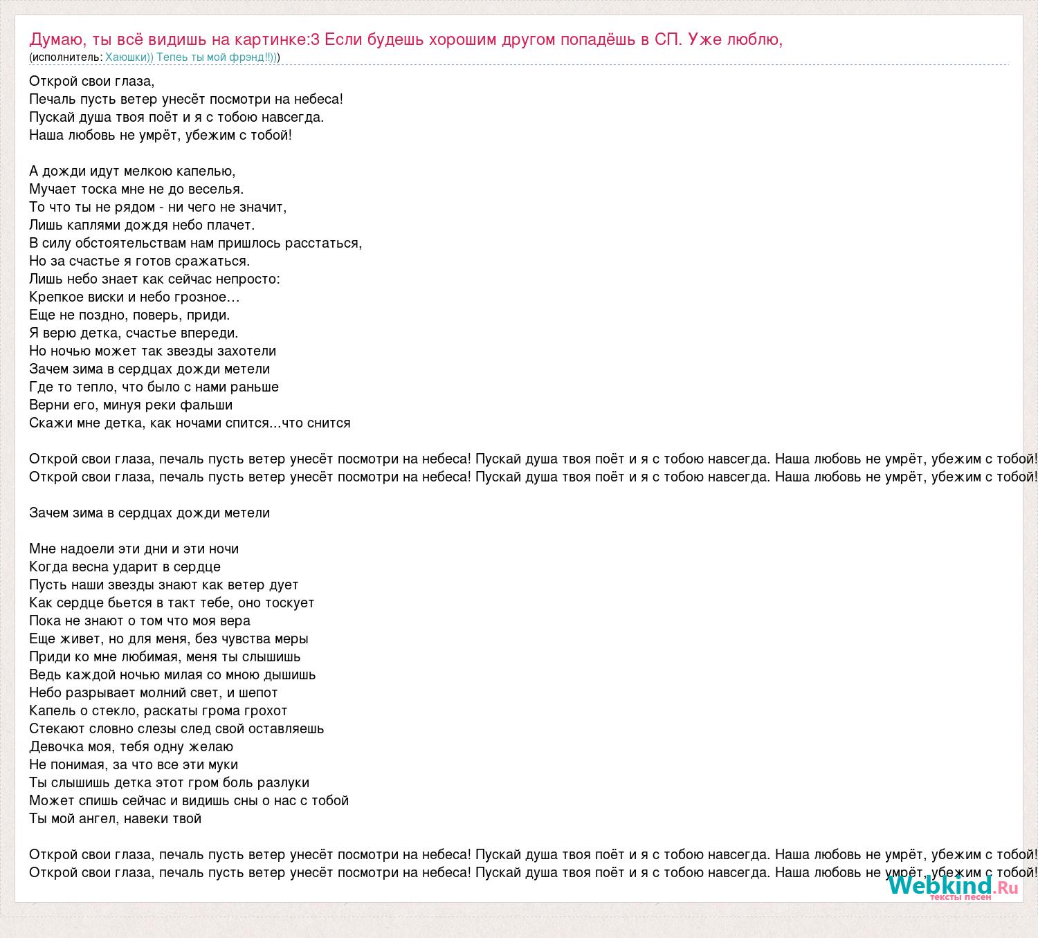 А как ты думаешь, о чем песня "Думаю, ты всё видишь на картинке:3 Если будешь хорошим другом попадёшь в СП. Уже" ?