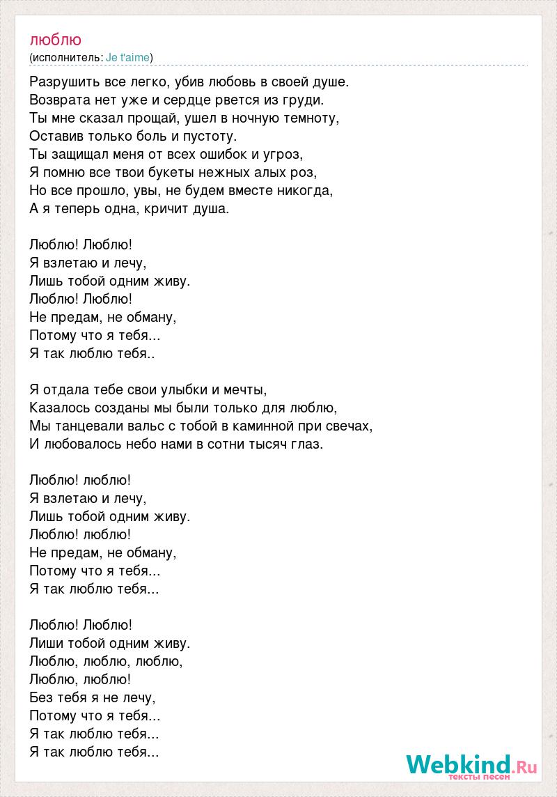 Разрушить все легко, убив любовь в своей душе. Возврата нет уже и сердце рвется из груди. Ты мне сказал прощай, ушел в ночную темноту, Оставив только боль и пустоту. Ты защищал меня от всех ошибок и угроз, Я помню все твои букеты нежных алых роз, Но все прошло, увы, не будем вместе никогда, А я теперь одна, кричит душа. Люблю! Люблю! Я взлетаю и лечу, Лишь тобой одним живу. Люблю! Люблю! Не предам, не обману, Потому что я тебя... Я так люблю тебя.. Я отдала тебе свои улыбки и мечты, Казалось созданы мы были только для люблю, Мы танцевали вальс с тобой в каминной при свечах, И любовалось небо нами в сотни тысяч глаз. Люблю! люблю! Я взлетаю и лечу, Лишь тобой одним живу. Люблю! люблю! Не предам, не обману, Потому что я тебя... Я так люблю тебя... Люблю! Люблю! Лиши тобой одним живу. Люблю, люблю, люблю, Люблю, люблю! Без тебя я не лечу, Потому что я тебя... Я так люблю тебя... Я так люблю тебя...