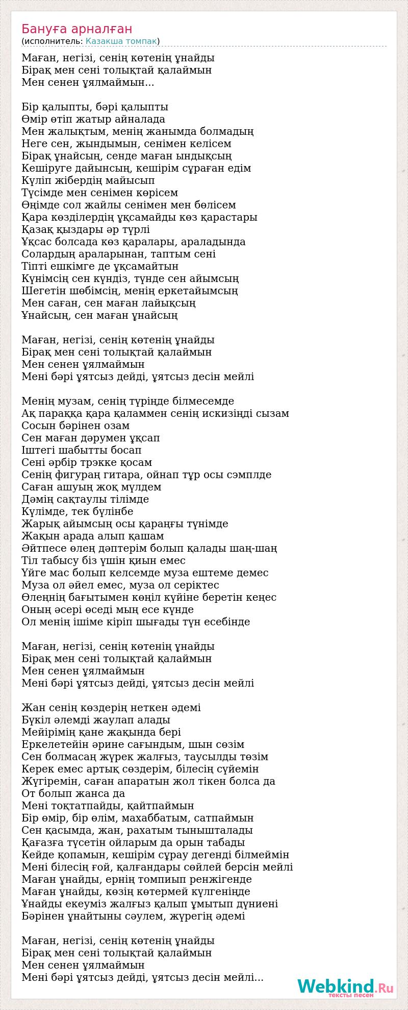 Маған, негізі, сенің көтенің ұнайды Бірақ мен сені толықтай қалаймын Мен сенен ұялмаймын... Бір қалыпты, бәрі қалыпты Өмір өтіп жатыр айналада Мен жалықтым, менің жанымда болмадың Неге сен, жындымын, сенімен келісем Бірақ ұнайсың, сенде маған ындықсың Кешіруге дайынсың, кешірім сұраған едім Күліп жібердің майысып Түсімде мен сенімен көрісем Өңімде сол жайлы сенімен мен бөлісем Қара көзділердің ұқсамайды көз қарастары Қазақ қыздары әр түрлі Ұқсас болсада көз қаралары, араладында Солардың араларынан, таптым сені Тіпті ешкімге де ұқсамайтын Күнімсің сен күндіз, түнде сен айымсың Шегетін шөбімсің, менің еркетайымсың Мен саған, сен маған лайықсың Ұнайсың, сен маған ұнайсың Маған, негізі, сенің көтенің ұнайды Бірақ мен сені толықтай қалаймын Мен сенен ұялмаймын Мені бәрі ұятсыз дейді, ұятсыз десін мейлі Менің музам, сенің түріңде білмесемде Ақ параққа қара қаламмен сенің искизіңді сызам Сосын бәрінен озам Сен маған дәрумен ұқсап Іштегі шабытты босап Сені әрбір трэкке қосам Сенің фигураң гитара, ойнап тұр осы сэмплде Саған ашуың жоқ мүлдем Дәмің сақтаулы тілімде Күлімде, тек бүлінбе Жарық айымсың осы қараңғы түнімде Жақын арада алып қашам Әйтпесе өлең дәптерім болып қалады шаң-шаң Тіл табысу біз үшін қиын емес Үйге мас болып келсемде муза ештеме демес Муза ол әйел емес, муза ол серіктес Өлеңнің бағытымен көңіл күйіне беретін кеңес Оның әсері өседі мың есе күнде Ол менің ішіме кіріп шығады түн есебінде Маған, негізі, сенің көтенің ұнайды Бірақ мен сені толықтай қалаймын Мен сенен ұялмаймын Мені бәрі ұятсыз дейді, ұятсыз десін мейлі Жан сенің көздерің неткен әдемі Бүкіл әлемді жаулап алады Мейірімің қане жақында бері Еркелетейін әрине сағындым, шын сөзім Сен болмасаң жүрек жалғыз, таусылды төзім Керек емес артық сөздерім, білесің сүйемін Жүгіремін, саған апаратын жол тікен болса да От болып жанса да Мені тоқтатпайды, қайтпаймын Бір өмір, бір өлім, махаббатым, сатпаймын Сен қасымда, жан, рахатым тынышталады Қағазға түсетін ойларым да орын табады Кейде қопамын, кешірім сұрау дегенді білмеймін Мені білесің ғой, қалғандары сөйлей берсін мейлі Маған ұнайды, ернің томпиып ренжігенде Маған ұнайды, көзің көтермей күлгеніңде Ұнайды екеуміз жалғыз қалып ұмытып дүниені Бәрінен ұнайтыны сәулем, жүрегің әдемі Маған, негізі, сенің көтенің ұнайды Бірақ мен сені толықтай қалаймын Мен сенен ұялмаймын Мені бәрі ұятсыз дейді, ұятсыз десін мейлі...