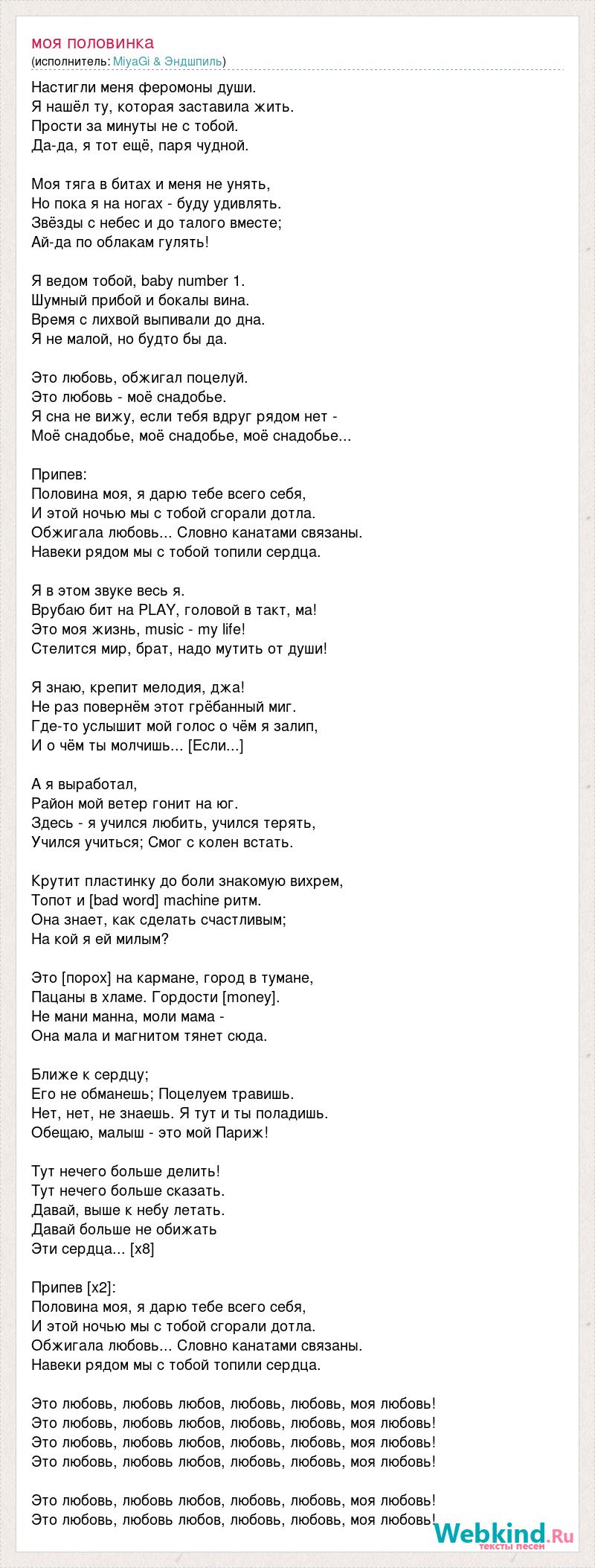 Настигли меня феромоны души. Я нашёл ту, которая заставила жить. Прости за минуты не с тобой. Да-да, я тот ещё, паря чудной. Моя тяга в битах и меня не унять, Но пока я на ногах - буду удивлять. Звёзды с небес и до талого вместе; Ай-да по облакам гулять! Я ведом тобой, baby number 1. Шумный прибой и бокалы вина. Время с лихвой выпивали до дна. Я не малой, но будто бы да. Это любовь, обжигал поцелуй. Это любовь - моё снадобье. Я сна не вижу, если тебя вдруг рядом нет - Моё снадобье, моё снадобье, моё снадобье... Припев: Половина моя, я дарю тебе всего себя, И этой ночью мы с тобой сгорали дотла. Обжигала любовь... Словно канатами связаны. Навеки рядом мы с тобой топили сердца. Я в этом звуке весь я. Врубаю бит на PLAY, головой в такт, ма! Это моя жизнь, music - my life! Стелится мир, брат, надо мутить от души! Я знаю, крепит мелодия, джа! Не раз повернём этот грёбанный миг. Где-то услышит мой голос о чём я залип, И о чём ты молчишь... [Если...] А я выработал, Район мой ветер гонит на юг. Здесь - я учился любить, учился терять, Учился учиться; Смог с колен встать. Крутит пластинку до боли знакомую вихрем, Топот и [bad word] machine ритм. Она знает, как сделать счастливым; На кой я ей милым? Это [порох] на кармане, город в тумане, Пацаны в хламе. Гордости [money]. Не мани манна, моли мама - Она мала и магнитом тянет сюда. Ближе к сердцу; Его не обманешь; Поцелуем травишь. Нет, нет, не знаешь. Я тут и ты поладишь. Обещаю, малыш - это мой Париж! Тут нечего больше делить! Тут нечего больше сказать. Давай, выше к небу летать. Давай больше не обижать Эти сердца... [x8] Припев [x2]: Половина моя, я дарю тебе всего себя, И этой ночью мы с тобой сгорали дотла. Обжигала любовь... Словно канатами связаны. Навеки рядом мы с тобой топили сердца. Это любовь, любовь любов, любовь, любовь, моя любовь! Это любовь, любовь любов, любовь, любовь, моя любовь! Это любовь, любовь любов, любовь, любовь, моя любовь! Это любовь, любовь любов, любовь, любовь, моя любовь! Это любовь, любовь любов, любовь, любовь, моя любовь! Это любовь, любовь любов, любовь, любовь, моя любовь!