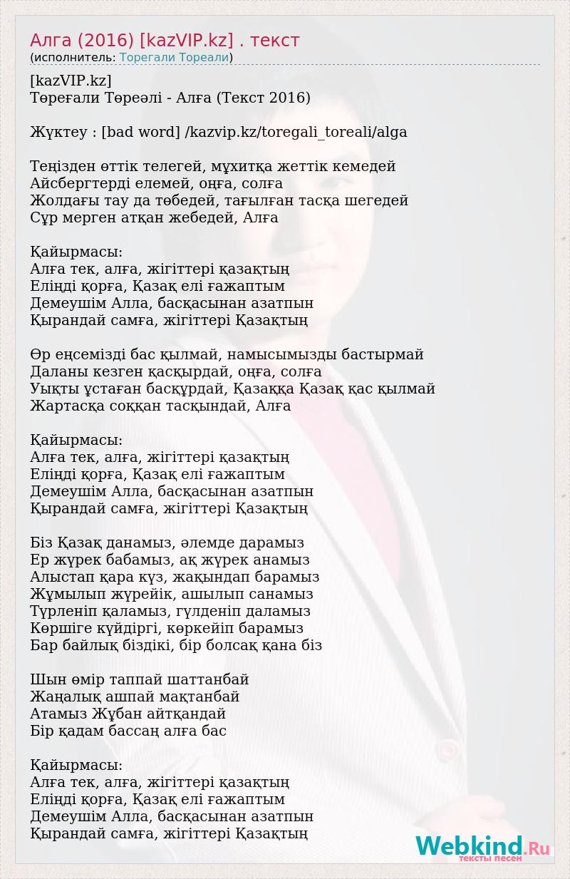 [kazVIP.kz] Төреғали Төреәлі - Алға (Текст 2016) 💾Жүктеу : [bad word] /kazvip.kz/toregali_toreali/alga Теңізден өттік телегей, мұхитқа жеттік кемедей Айсбергтерді елемей, оңға, солға Жолдағы тау да төбедей, тағылған тасқа шегедей Сұр мерген атқан жебедей, Алға Қайырмасы: Алға тек, алға, жігіттері қазақтың Еліңді қорға, Қазақ елі ғажаптым Демеушім Алла, басқасынан азатпын Қырандай самға, жігіттері Қазақтың Өр еңсемізді бас қылмай, намысымызды бастырмай Даланы кезген қасқырдай, оңға, солға Уықты ұстаған басқұрдай, Қазаққа Қазақ қас қылмай Жартасқа соққан тасқындай, Алға Қайырмасы: Алға тек, алға, жігіттері қазақтың Еліңді қорға, Қазақ елі ғажаптым Демеушім Алла, басқасынан азатпын Қырандай самға, жігіттері Қазақтың Біз Қазақ данамыз, әлемде дарамыз Ер жүрек бабамыз, ақ жүрек анамыз Алыстап қара күз, жақындап барамыз Жұмылып жүрейік, ашылып санамыз Түрленіп қаламыз, гүлденіп даламыз Көршіге күйдіргі, көркейіп барамыз Бар байлық біздікі, бір болсақ қана біз Шын өмір таппай шаттанбай Жаңалық ашпай мақтанбай Атамыз Жұбан айтқандай Бір қадам бассаң алға бас Қайырмасы: Алға тек, алға, жігіттері қазақтың Еліңді қорға, Қазақ елі ғажаптым Демеушім Алла, басқасынан азатпын Қырандай самға, жігіттері Қазақтың