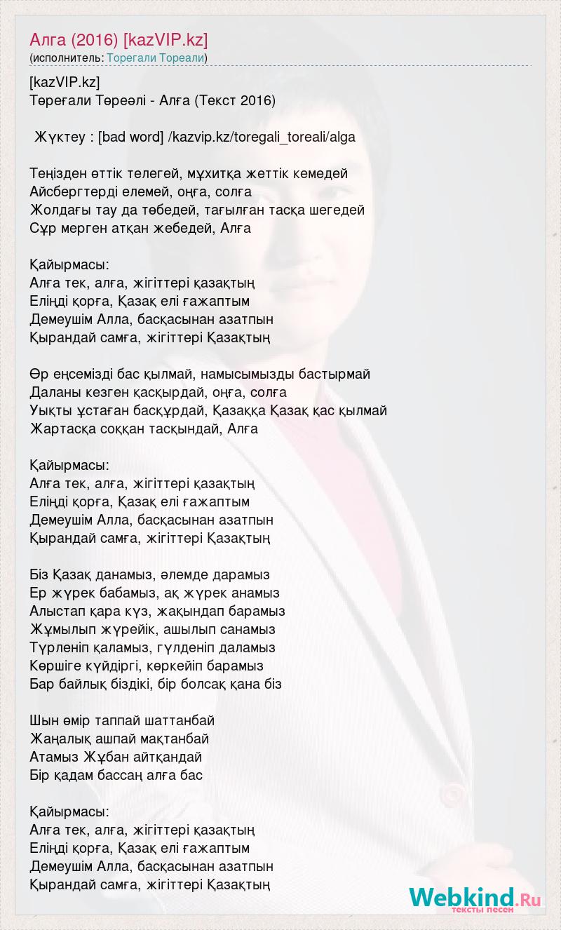 [kazVIP.kz] Төреғали Төреәлі - Алға (Текст 2016) 💾Жүктеу : [bad word] /kazvip.kz/toregali_toreali/alga Теңізден өттік телегей, мұхитқа жеттік кемедей Айсбергтерді елемей, оңға, солға Жолдағы тау да төбедей, тағылған тасқа шегедей Сұр мерген атқан жебедей, Алға Қайырмасы: Алға тек, алға, жігіттері қазақтың Еліңді қорға, Қазақ елі ғажаптым Демеушім Алла, басқасынан азатпын Қырандай самға, жігіттері Қазақтың Өр еңсемізді бас қылмай, намысымызды бастырмай Даланы кезген қасқырдай, оңға, солға Уықты ұстаған басқұрдай, Қазаққа Қазақ қас қылмай Жартасқа соққан тасқындай, Алға Қайырмасы: Алға тек, алға, жігіттері қазақтың Еліңді қорға, Қазақ елі ғажаптым Демеушім Алла, басқасынан азатпын Қырандай самға, жігіттері Қазақтың Біз Қазақ данамыз, әлемде дарамыз Ер жүрек бабамыз, ақ жүрек анамыз Алыстап қара күз, жақындап барамыз Жұмылып жүрейік, ашылып санамыз Түрленіп қаламыз, гүлденіп даламыз Көршіге күйдіргі, көркейіп барамыз Бар байлық біздікі, бір болсақ қана біз Шын өмір таппай шаттанбай Жаңалық ашпай мақтанбай Атамыз Жұбан айтқандай Бір қадам бассаң алға бас Қайырмасы: Алға тек, алға, жігіттері қазақтың Еліңді қорға, Қазақ елі ғажаптым Демеушім Алла, басқасынан азатпын Қырандай самға, жігіттері Қазақтың