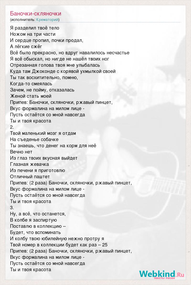 Я разделил твоё тело Ножом на три части И сердце пропил, почки продал, А лёгкие сжёг Всё было прекрасно, но вдруг навалилось несчастье Я всё обыскал, но нигде не нашёл твоих ног Отрезанная голова твоя мне улыбалась Куда там Джоконде с корявой ухмылкой своей Ты так восхитительно, помню, Когда-то смеялась Зачем, не пойму, отказалась Женой стать моей Припев: Баночки, скляночки, ржавый пинцет, Вкус формалина на милом лице - Пусть остаётся со мной навсегда Ты и твоя красота 2. Твой маленький мозг я отдам На съеденье собачке Ты знаешь, что денег на корм для неё Вечно нет Из глаз твоих вкусная выйдет Глазная жевачка Из печени я приготовлю Отличный паштет Припев: (2 раза) Баночки, скляночки, ржавый пинцет, Вкус формалина на милом лице - Пусть остаётся со мной навсегда Ты и твоя красота 3. Ну, а всё, что останется, В колбе я заспиртую Поставлю в коллекцию – Будет, что вспоминать И колбу твою юбилейную нежно протру я Твой номер в коллекции будет как раз – 25 Припев: (2 раза) Баночки, скляночки, ржавый пинцет, Вкус формалина на милом лице - Пусть остаётся со мной навсегда Ты и твоя красота