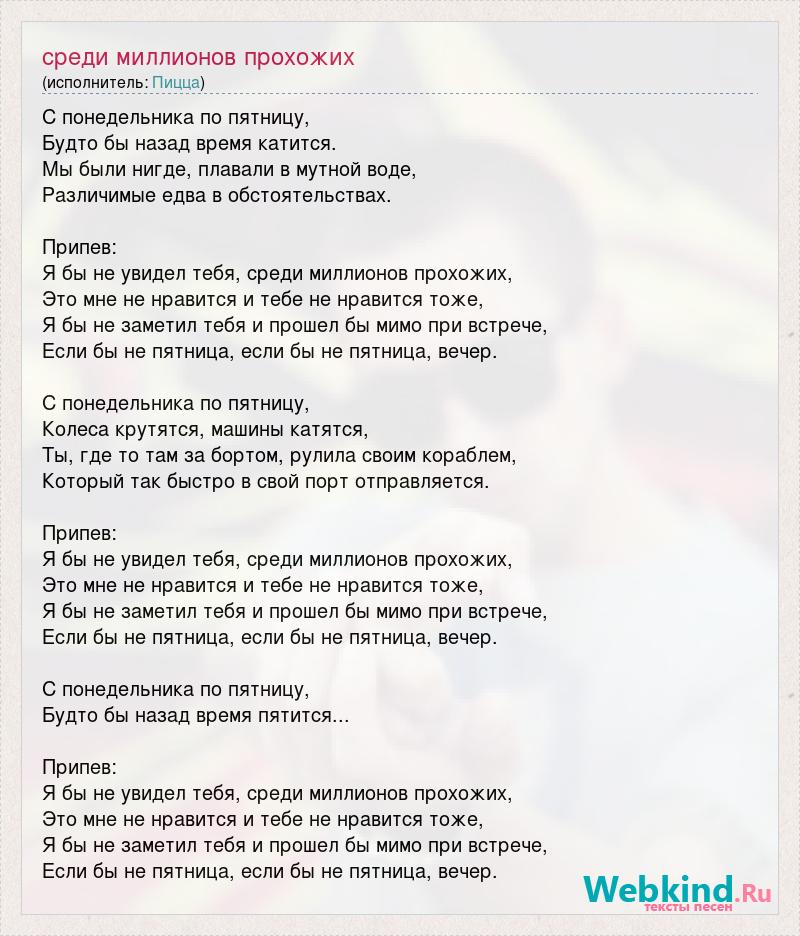 С понедельника по пятницу, Будто бы назад время катится. Мы были нигде, плавали в мутной воде, Различимые едва в обстоятельствах. Припев: Я бы не увидел тебя, среди миллионов прохожих, Это мне не нравится и тебе не нравится тоже, Я бы не заметил тебя и прошел бы мимо при встрече, Если бы не пятница, если бы не пятница, вечер. С понедельника по пятницу, Колеса крутятся, машины катятся, Ты, где то там за бортом, рулила своим кораблем, Который так быстро в свой порт отправляется. Припев: Я бы не увидел тебя, среди миллионов прохожих, Это мне не нравится и тебе не нравится тоже, Я бы не заметил тебя и прошел бы мимо при встрече, Если бы не пятница, если бы не пятница, вечер. С понедельника по пятницу, Будто бы назад время пятится... Припев: Я бы не увидел тебя, среди миллионов прохожих, Это мне не нравится и тебе не нравится тоже, Я бы не заметил тебя и прошел бы мимо при встрече, Если бы не пятница, если бы не пятница, вечер.
