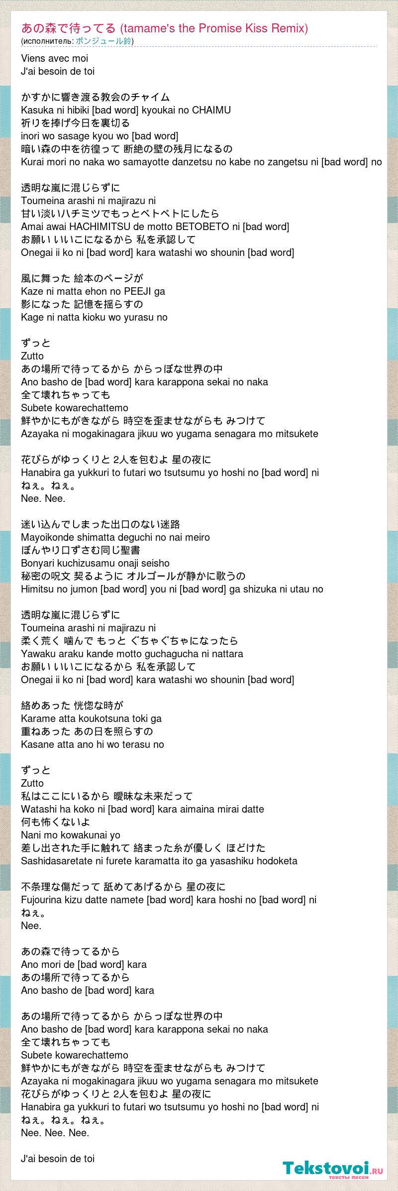 Viens avec moi J'ai besoin de toi かすかに響き渡る教会のチャイム Kasuka ni hibiki wataru kyoukai no CHAIMU 祈りを捧げ今日を裏切る inori wo sasage kyou wo uragiru 暗い森の中を彷徨って 断絶の壁の残月になるの Kurai mori no naka wo samayotte danzetsu no kabe no zangetsu ni naru no 透明な嵐に混じらずに Toumeina arashi ni majirazu ni 甘い淡いハチミツでもっとベトベトにしたら Amai awai HACHIMITSU de motto BETOBETO ni [bad word] お願い いいこになるから 私を承認して Onegai ii ko ni naru kara watashi wo shounin [bad word] 風に舞った 絵本のページが Kaze ni matta ehon no PEEJI ga 影になった 記憶を揺らすの Kage ni natta kioku wo yurasu no ずっと Zutto あの場所で待ってるから からっぽな世界の中 Ano basho de matteru kara karappona sekai no naka 全て壊れちゃっても Subete kowarechattemo 鮮やかにもがきながら 時空を歪ませながらも みつけて Azayaka ni mogakinagara jikuu wo yugama senagara mo mitsukete 花びらがゆっくりと 2人を包むよ 星の夜に Hanabira ga yukkuri to futari wo tsutsumu yo hoshi no yoru ni ねぇ。ねぇ。 Nee. Nee. 迷い込んでしまった出口のない迷路 Mayoikonde shimatta deguchi no nai meiro ぼんやり口ずさむ同じ聖書 Bonyari kuchizusamu onaji seisho 秘密の呪文 契るように オルゴールが静かに歌うの Himitsu no jumon chigiru you ni ORUGOORU ga shizuka ni utau no 透明な嵐に混じらずに Toumeina arashi ni majirazu ni 柔く荒く 噛んで もっと ぐちゃぐちゃになったら Yawaku araku kande motto guchagucha ni nattara お願い いいこになるから 私を承認して Onegai ii ko ni naru kara watashi wo shounin [bad word] 絡めあった 恍惚な時が Karame atta koukotsuna toki ga 重ねあった あの日を照らすの Kasane atta ano hi wo terasu no ずっと Zutto 私はここにいるから 曖昧な未来だって Watashi ha koko ni iru kara aimaina mirai datte 何も怖くないよ Nani mo kowakunai yo 差し出された手に触れて 絡まった糸が優しく ほどけた Sashidasaretate ni furete karamatta ito ga yasashiku hodoketa 不条理な傷だって 舐めてあげるから 星の夜に Fujourina kizu datte namete ageru kara hoshi no yoru ni ねぇ。 Nee. あの森で待ってるから Ano mori de matteru kara あの場所で待ってるから Ano basho de matteru kara あの場所で待ってるから からっぽな世界の中 Ano basho de matteru kara karappona sekai no naka 全て壊れちゃっても Subete kowarechattemo 鮮やかにもがきながら 時空を歪ませながらも みつけて Azayaka ni mogakinagara jikuu wo yugama senagara mo mitsukete 花びらがゆっくりと 2人を包むよ 星の夜に Hanabira ga yukkuri to futari wo tsutsumu yo hoshi no yoru ni ねぇ。ねぇ。ねぇ。 Nee. Nee. Nee. J'ai besoin de toi