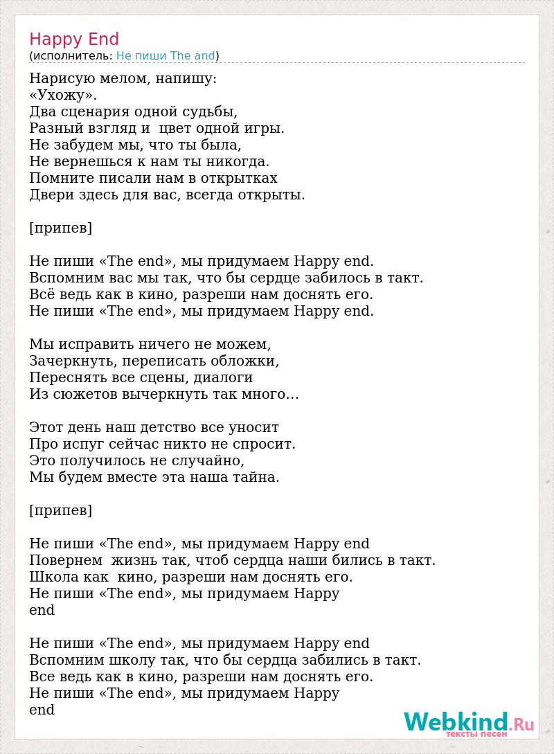 Нарисую мелом, напишу: «Ухожу». Два сценария одной судьбы, Разный взгляд и цвет одной игры. Не забудем мы, что ты была, Не вернешься к нам ты никогда. Помните писали нам в открытках Двери здесь для вас, всегда открыты. [припев] Не пиши «The end», мы придумаем Happy end. Вспомним вас мы так, что бы сердце забилось в такт. Всё ведь как в кино, разреши нам доснять его. Не пиши «The end», мы придумаем Happy end. Мы исправить ничего не можем, Зачеркнуть, переписать обложки, Переснять все сцены, диалоги Из сюжетов вычеркнуть так много… Этот день наш детство все уносит Про испуг сейчас никто не спросит. Это получилось не случайно, Мы будем вместе эта наша тайна. [припев] Не пиши «The end», мы придумаем Happy end Повернем жизнь так, чтоб сердца наши бились в такт. Школа как кино, разреши нам доснять его. Не пиши «The end», мы придумаем Happy end Не пиши «The end», мы придумаем Happy end Вспомним школу так, что бы сердца забились в такт. Все ведь как в кино, разреши нам доснять его. Не пиши «The end», мы придумаем Happy end