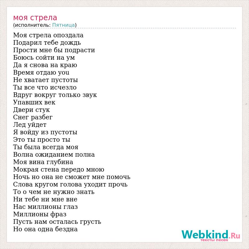 Моя стрела опоздала Подарил тебе дождь Прости мне бы подрасти Боюсь сойти на ум Да я снова на краю Время отдаю you Не хватает пустоты Ты все что исчезло Вдруг вокруг только звук Упавших век Двери стук Снег разбег Лед уйдет Я войду из пустоты Это ты просто ты Ты была всегда моя Волна ожиданием полна Моя вина глубина Мокрая стена передо мною Ночь но она не сможет мне помочь Слова кругом голова уходит прочь То о чем не нужно знать Ни тебе ни мне вне Нас миллионы глаз Миллионы фраз Пусть нам осталась грусть Но она одна бездна