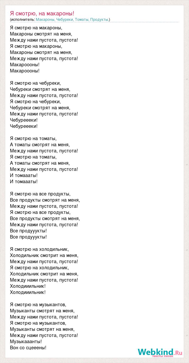 Я смотрю на макароны, Макароны смотрят на меня, Между нами пустота, пустота! Я смотрю на макароны, Макароны смотрят на меня, Между нами пустота, пустота! Макароооны! Макароооны! Я смотрю на чебуреки, Чебуреки смотрят на меня, Между нами пустота, пустота! Я смотрю на чебуреки, Чебуреки смотрят на меня, Между нами пустота, пустота! Чебуреееки! Чебуреееки! Я смотрю на томаты, А томаты смотрят на меня, Между нами пустота, пустота! Я смотрю на томаты, А томаты смотрят на меня, Между нами пустота, пустота! И томаааты! И томаааты! Я смотрю на все продукты, Все продукты смотрят на меня, Между нами пустота, пустота! Я смотрю на все продукты, Все продукты смотрят на меня, Между нами пустота, пустота! Все продууукты! Все продууукты! Я смотрю на холодильник, Холодильник смотрит на меня, Между нами пустота, пустота! Я смотрю на холодильник, Холодильник смотрит на меня, Между нами пустота, пустота! Холодииильник! Холодииильник! Я смотрю на музыкантов, Музыканты смотрят на меня, Между нами пустота, пустота! Я смотрю на музыкантов, Музыканты смотрят на меня, Между нами пустота, пустота! Музыкааанты! Вон со сцееены!