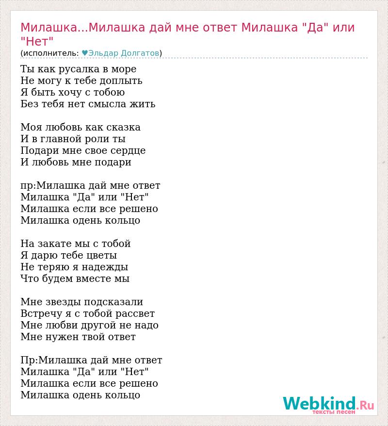 Ты как русалка в море Не могу к тебе доплыть Я быть хочу с тобою Без тебя нет смысла жить Моя любовь как сказка И в главной роли ты Подари мне свое сердце И любовь мне подари пр:Милашка дай мне ответ Милашка "Да" или "Нет" Милашка если все решено Милашка одень кольцо На закате мы с тобой Я дарю тебе цветы Не теряю я надежды Что будем вместе мы Мне звезды подсказали Встречу я с тобой рассвет Мне любви другой не надо Мне нужен твой ответ Пр:Милашка дай мне ответ Милашка "Да" или "Нет" Милашка если все решено Милашка одень кольцо
