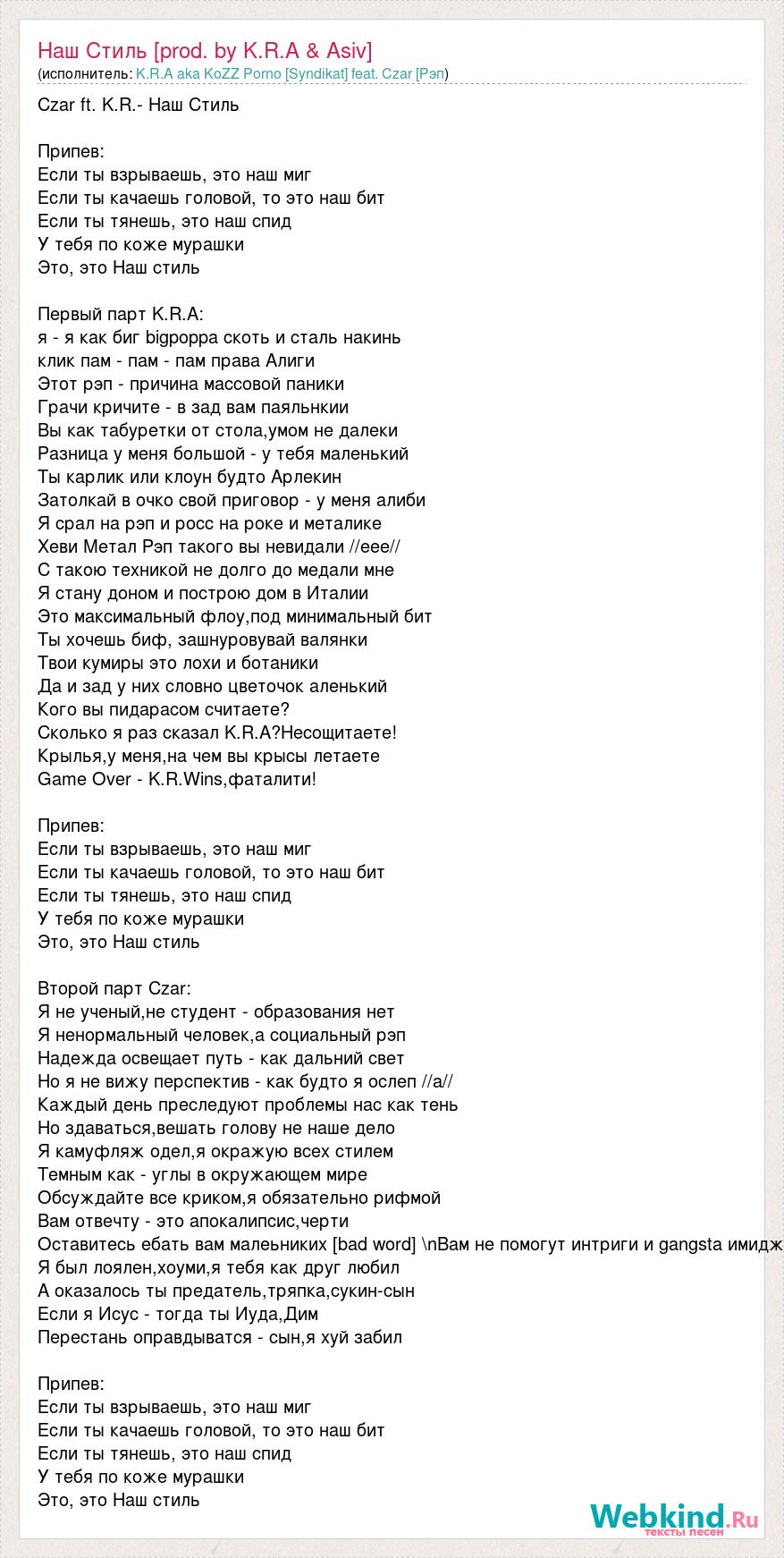 Czar ft. K.R.- Наш Стиль Припев: Если ты взрываешь, это наш миг Если ты качаешь головой, то это наш бит Если ты тянешь, это наш спид У тебя по коже мурашки Это, это Наш стиль Первый парт K.R.A: я - я как биг bigpoppa cкоть и сталь накинь клик пам - пам - пам права Алиги Этот рэп - причина массовой паники Грачи кричите - в зад вам паяльнкии Вы как табуретки от стола,умом не далеки Разница у меня большой - у тебя маленький Ты карлик или клоун будто Арлекин Затолкай в очко свой приговор - у меня алиби Я срал на рэп и росс на роке и металике Хеви Метал Рэп такого вы невидали //еее// С такою техникой не долго до медали мне Я стану доном и построю дом в Италии Это максимальный флоу,под минимальный бит Ты хочешь биф, зашнуровувай валянки Твои кумиры это лохи и ботаники Да и зад у них словно цветочок аленький Кого вы пидарасом считаете? Сколько я раз сказал K.R.A?Несощитаете! Крылья,у меня,на чем вы крысы летаете Game Over - K.R.Wins,фаталити! Припев: Если ты взрываешь, это наш миг Если ты качаешь головой, то это наш бит Если ты тянешь, это наш спид У тебя по коже мурашки Это, это Наш стиль Второй парт Czar: Я не ученый,не студент - образования нет Я ненормальный человек,а социальный рэп Надежда освещает путь - как дальний свет Но я не вижу перспектив - как будто я ослеп //а// Каждый день преследуют проблемы нас как тень Но здаваться,вешать голову не наше дело Я камуфляж одел,я окражую всех стилем Темным как - углы в окружающем мире Обсуждайте все криком,я обязательно рифмой Вам отвечту - это апокалипсис,черти Оставитесь ебать вам малеьниких [bad word] \nВам не помогут интриги и gangsta имидж Я был лоялен,хоуми,я тебя как друг любил А оказалось ты предатель,тряпка,сукин-сын Если я Исус - тогда ты Иуда,Дим Перестань оправдыватся - сын,я хуй забил Припев: Если ты взрываешь, это наш миг Если ты качаешь головой, то это наш бит Если ты тянешь, это наш спид У тебя по коже мурашки Это, это Наш стиль