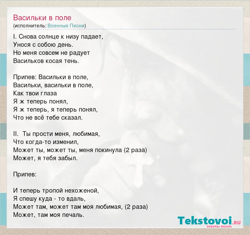 I. Снова солнце к низу падает, Унося с собою день. Но меня совсем не радует Васильков косая тень. Припев: Васильки в поле, Васильки, васильки в поле, Как твои глаза Я ж теперь понял, Я ж теперь, я теперь понял, Что не всё тебе сказал. II. Ты прости меня, любимая, Что когда-то изменил, Может ты, может ты, меня покинула (2 раза) Может, я тебя забыл. Припев: И теперь тропой нехоженой, Я спешу куда - то вдаль, Может там, может там моя любимая, (2 раза) Может, там моя печаль.